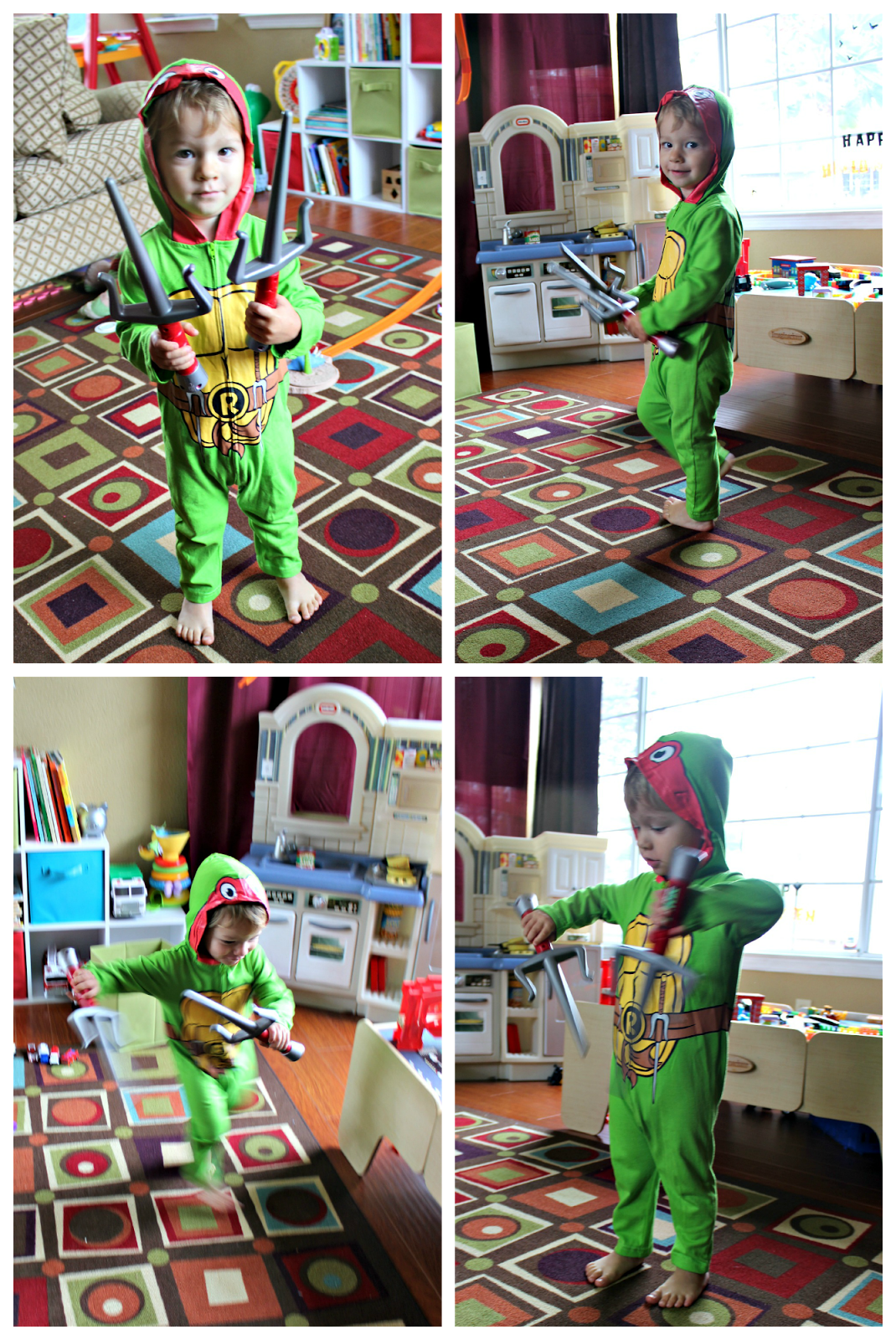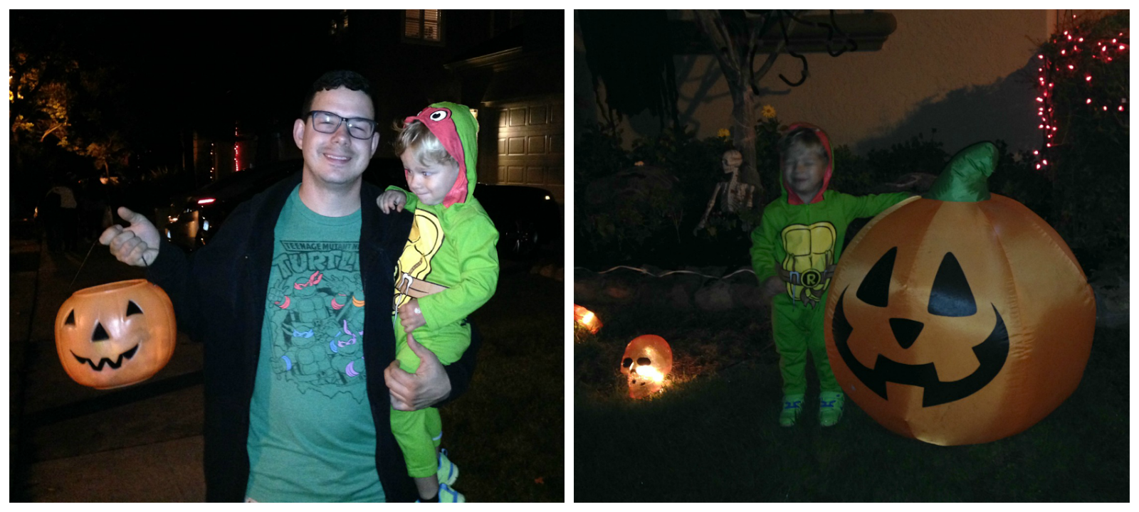Last year Halloween night was pretty awesome, so I wasn't sure if this year would compare... especially since Myles decided he no longer wanted to wear the Spider-man costume that he picked out! He had been telling me he wanted to be Spider-man for weeks so that's what I bought. He wore it around the house a couple times, and then as actual Halloween got closer and closer he wanted nothing to do with it... like meltdown city style. So I returned it and started brainstorming a plan b. I could only gather that what he didn't like about the costume was the puffy muscle part and I already knew that he wouldn't go for anything on his face. I went to Target to see if I could find something that was like pajamas, but could still be seen as a costume... no such luck. Then I went to the Spirit store and found a Ninja Turtle onesie that was just like normal clothes. Myles picked out the Raphael one and I was very hopeful this one would work out! It took a little coaxing and explaining but we had success!