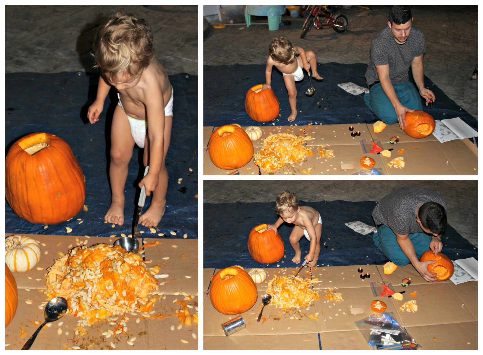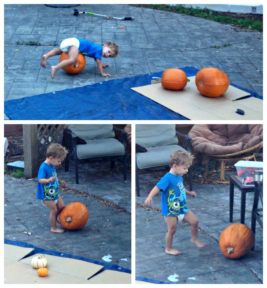 Oh my gosh. Myles is the cutest and funniest pumpkin carver! Love that he does it naked (well with a diaper) so he doesn't make a huge mess. That and the rolling on the pumpkin! Too cute.