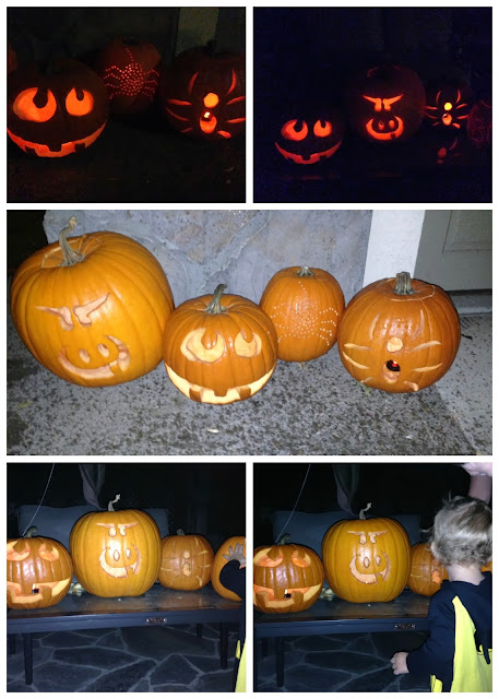 The pig one is Mark's. He made it in honor of Myles' nickname: Baby Ham. The second one is grandpa's; a little Jack Skellington inspired. The third one is mine. I thought I would give the drill carving a try. I really liked doing it; it was way easier than using a knife and you can do fun designs. I discovered after I was done though, that even with a candle inside, it is hard to see my design. Next time I will use a bigger drill bit and hopefully that will make it easier to see. The last one is grandma's. She did a cool spider!