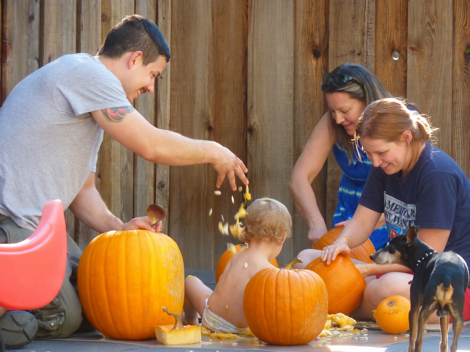 During the daytime, we carved our pumpkins together. I knew Myles would LOVE the pumpkin guts, so I set up shop outside and let him go at it. I just put some cardboard boxes down over the rubber mats we have in the backyard. My favorite part of carving is the guts and getting messy too, so Myles and I cleaned out three pumpkins. We all were throwing guts on him and he was having the time of his life. I gave him a spoon and he went to town trying to dig out guts and seeds.