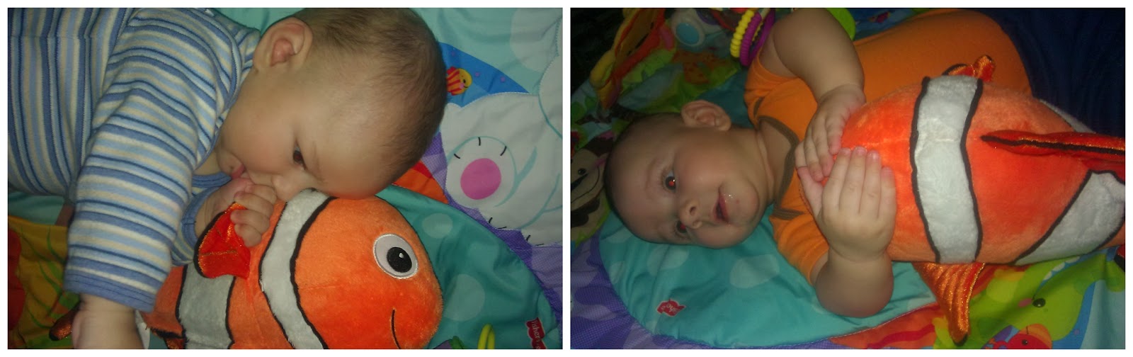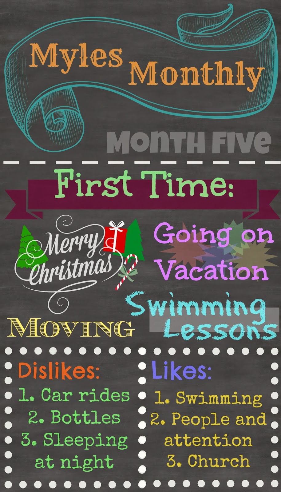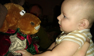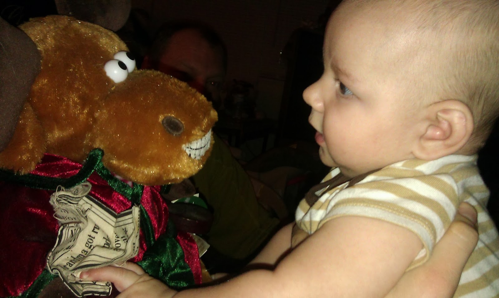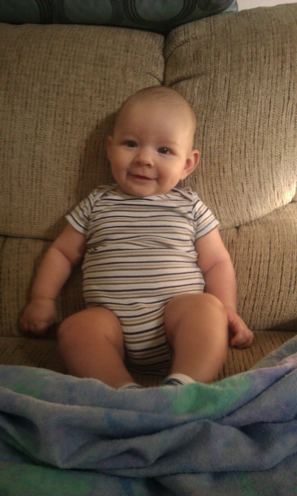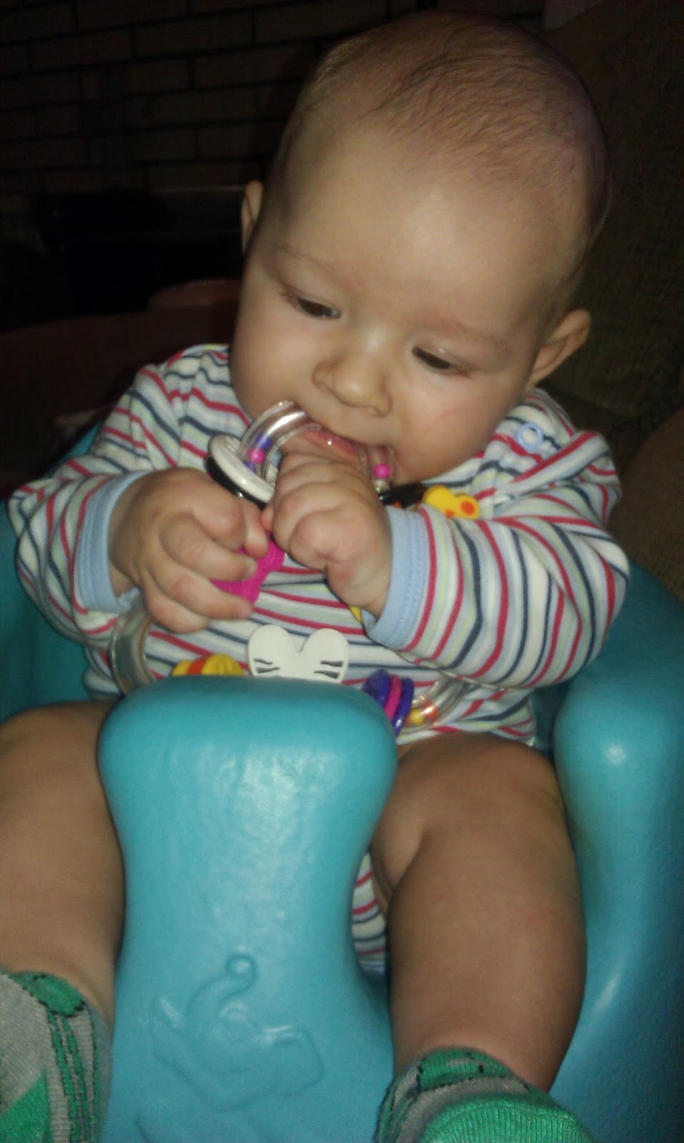 We actually had a pretty good 5th month as far as health goes. No doctor visits or weird new habits (that I tend to freak out about). He did get his first stuffy nose though. It only took one night of being in the new place for him to wake up with a stuffy nose. The apartment is quite old and the air circulation was very poor. The heat wasn't working the greatest either. So at night we would have a heater and humidifier going. It didn't seem to really bother him. You could tell he was stuffed-up when he nursed and had a hard time breathing out of his nose, but other than that he really didn't act upset about it. It cleared up in about two weeks, but I still kept the humidifier going so that air wouldn't be too dry.His teething continued on in full-force. We had no teeth yet, but EVERYTHING was still going straight to the mouth. We got him the infamous Vulli Sophie the Giraffe Teether for Christmas. I was hoping for it to be the Holy Grail of teethers, but he really did not care for it at all. He did end up really taking a liking to it, but I think it was just too big for him to maneuver into his mouth at first. He was more about variety; he would pick something up, chew on it for a bit, get bored, then move on to the next item.