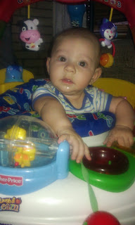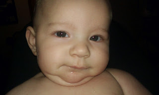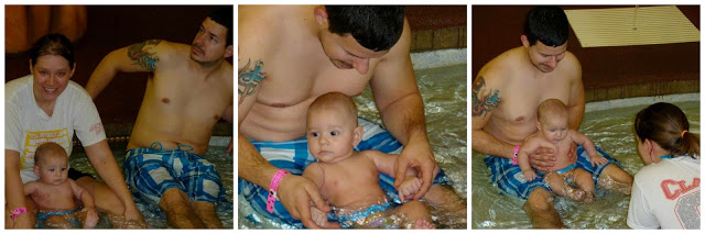 First swim lesson: After we got back from vacation, I began researching swimming for babies. I found a place in our town that started at 4 months. I was also looking for something to get us out of the house; an activity we could all do together. We went for our first trial class right before Myles turned 5 months. I figured it would be best for Mark to go in with him and I would dress him and such after. He didn't cry at all and was very attentive. He did swallow a little bit of water, and threw up some sweet potatoes :( But it didn't stop him from having the time of his life :) It's a really great class that gets little ones acclimated to the water. They sing songs and do fun activities all while teaching them beginner skills and pool safety. I think Myles taking these classes really fostered his physical development. I highly recommend swimming classes with your little ones!