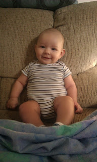 Assisted sitting: Myles started doing a little assisted sitting. He would sit with the boppy pillow behind him or leaning forward with his hands on the floor holding him up. He wasn't at all stable though and would fall back within seconds. We still practiced everyday and he did it stronger.