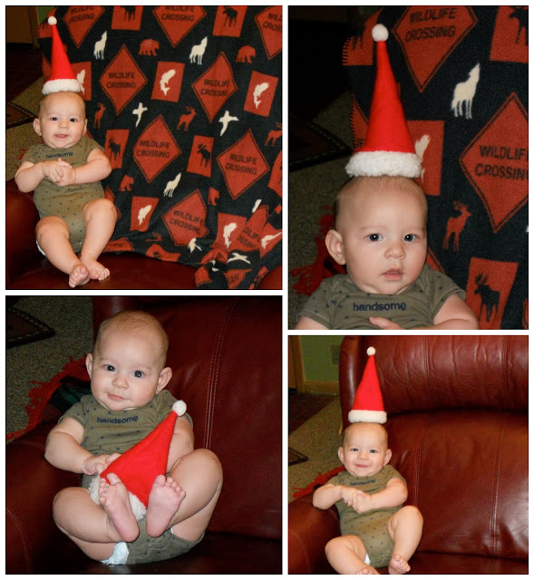 - Myles also had his first Christmas this month. Since we had just moved, we didn't get to set up a tree or even decorate. We did go to our families to celebrate, but it just wasn't what I had always envisioned for his 1st Christmas, so I am going to be considering this year as Myles' first real Christmas (Santa, decorations, trees, traditions, and all)! He had no idea what was going on except that a lot of people were giving him tons of love, affection, and attention. My mother decided to dress up her grandson (seeing a theme... remember the Thanksgiving photo session) as a little elf.