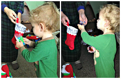 | Myles getting his stocking gifts: little race car and bird call! |