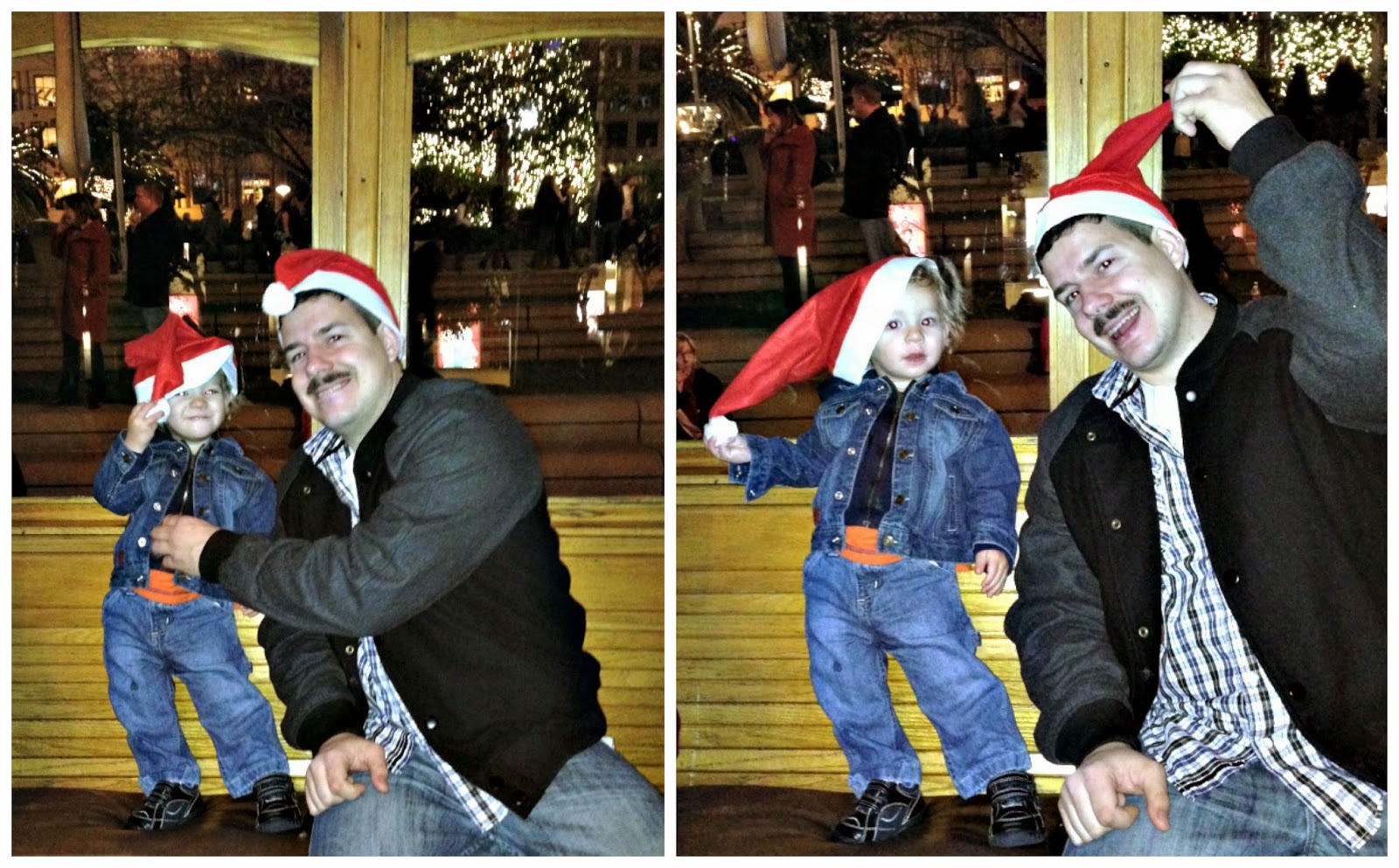 I have the Groupon app on my phone and every couple of weeks I check out what they have near us. I was SUPER excited when I found one for the holiday lights tour on a Classic Cable Car in downtown San Fransisco! I love touristy stuff like that, so I grabbed up my first Groupon real quick. We took BART to Union Square. They were running a little behind so we were able to check out all the decorations in the Square before we took our tour.