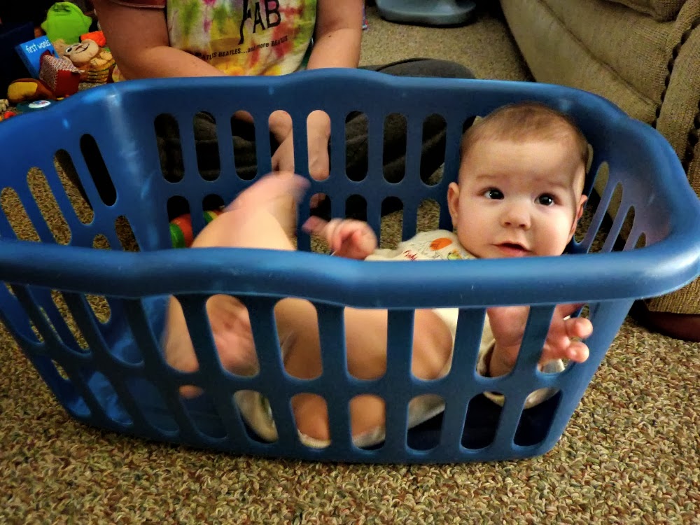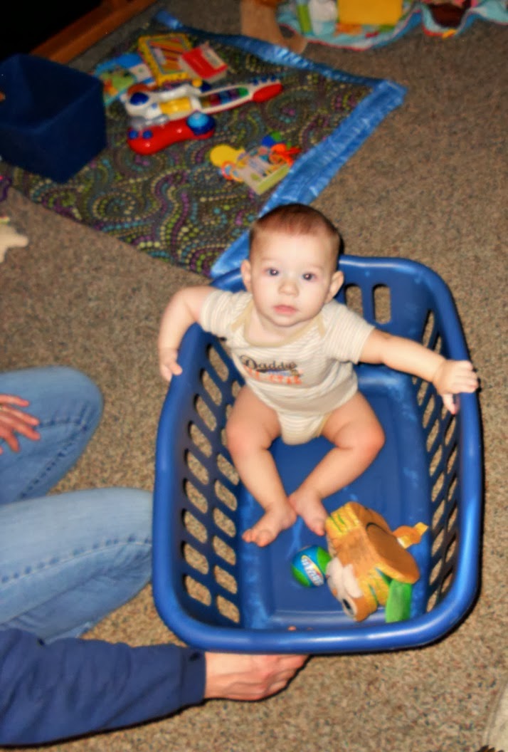 - He discovered the hamper this month. He loved sitting in it and being pushed around or rocked back and forth. If he was ever in a bad mood, putting him in the hamper always turned his attitude around!