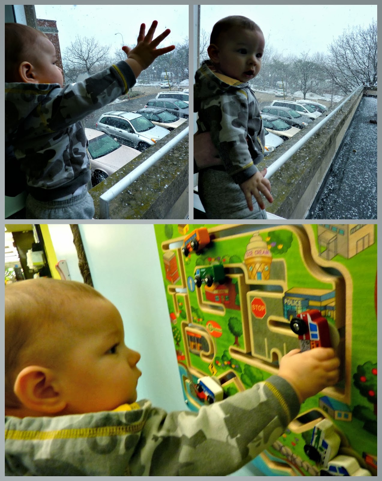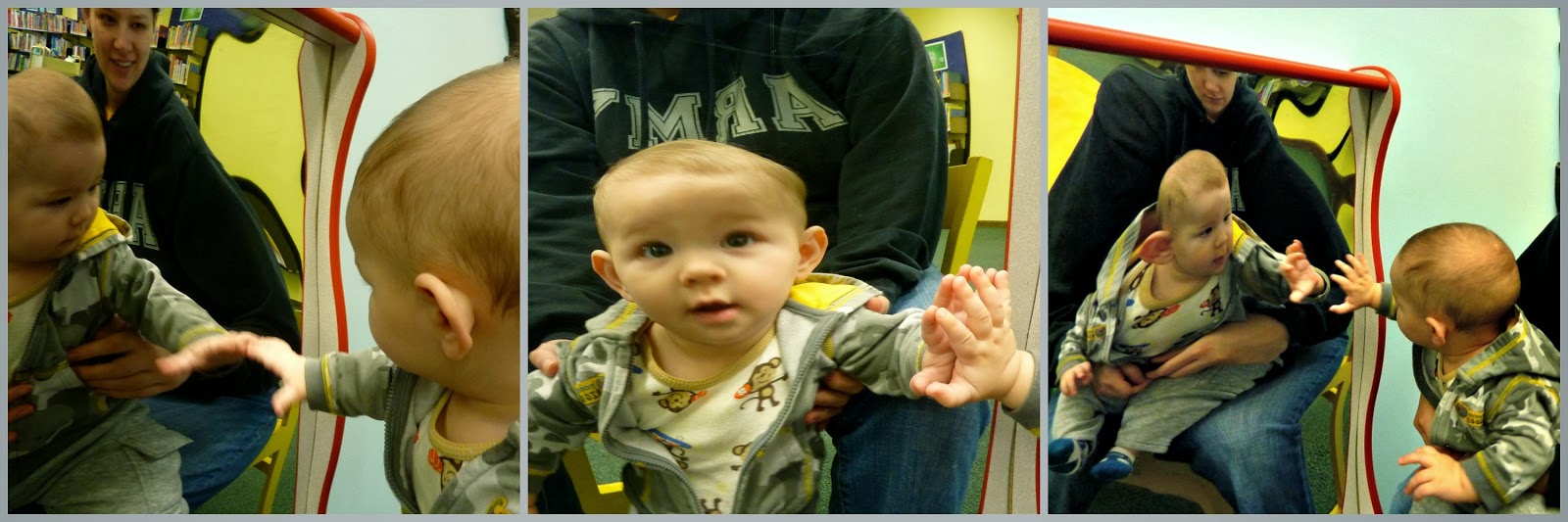- Since it was still snowing most of this month, we tried to find as many indoor activities as possible. Myles was getting more and more mobile and really wanting to explore. It was fun finding new things for him to do as he became more engaged and active. We went to the library for the first time. We looked at some books (he was not interested yet) and checked out some of their toys.