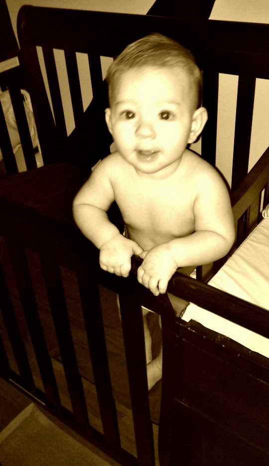 Not much had changed since Six Months. Still taking 30 minute naps about every 2 hours now. I stopped putting him in his crib for his naps. Since he started pulling up to standing this month, it was impossible to get him to fall asleep for his naps in the crib. I would nurse until he was drowsy, then lay him down in the crib. He would instantly get up and stand at the crib railing, crying and crying. I was still not sleeping at all during the night, so I was too exhausted to fight him several times a day, just for a 30 minute nap. I just started laying down with him when he took his naps. He would side-lay nurse until he fell asleep and I would just hangout until he woke up. It worked for us at the time because I needed the break and it got him to sleep.