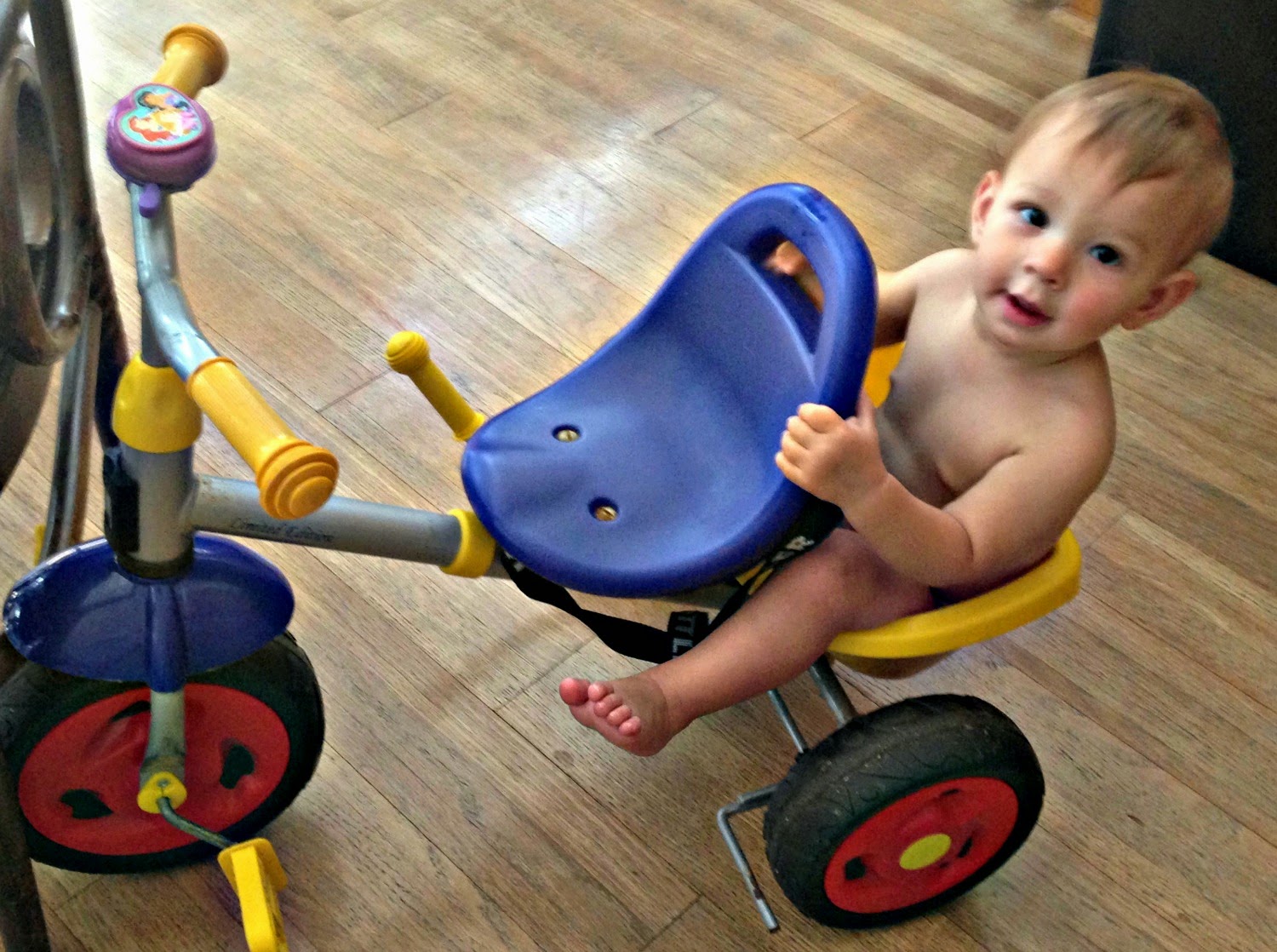 • I took off the push bar on his tricycle and he decided this was the place to be! At this age, it was so fun to sit back and let him do his thing, just to see what kind of ideas he would come up with. I was surprised daily by the workings of his mind!