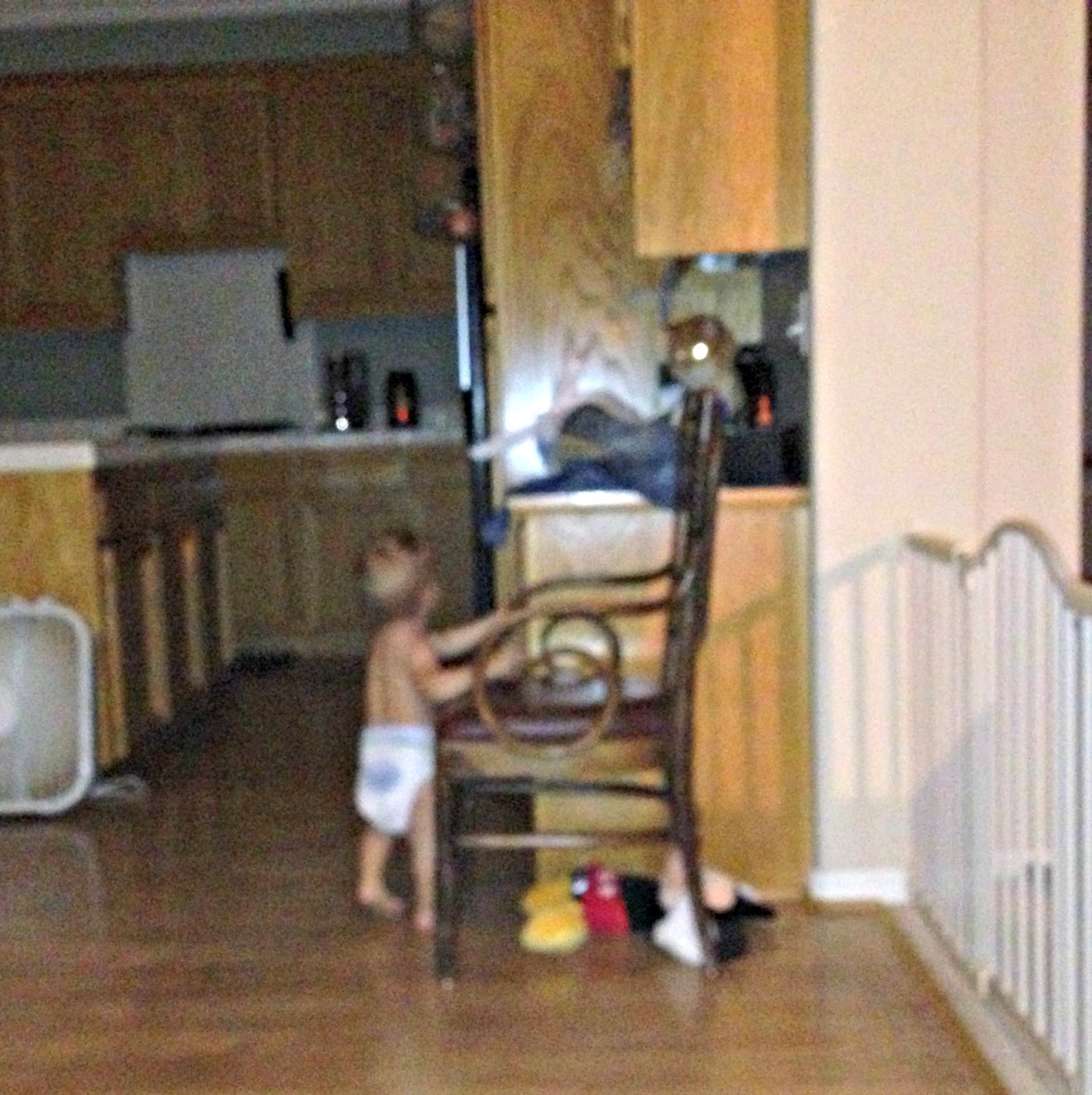 • If his mind workings were any indication as to what we would be in store for in the future... I am scared! At this point, he had no fears, no boundaries, and no limitations to his explorations. You want to get to the cat that is on the counter, but you can't reach the top of the counter... well then duh.. go get a dining room chair and push it across the whole kitchen over to the counter. Then you can climb on the chair to get to the counter, and then the cat is all YOURS!!! Oh my lands... help my future self!