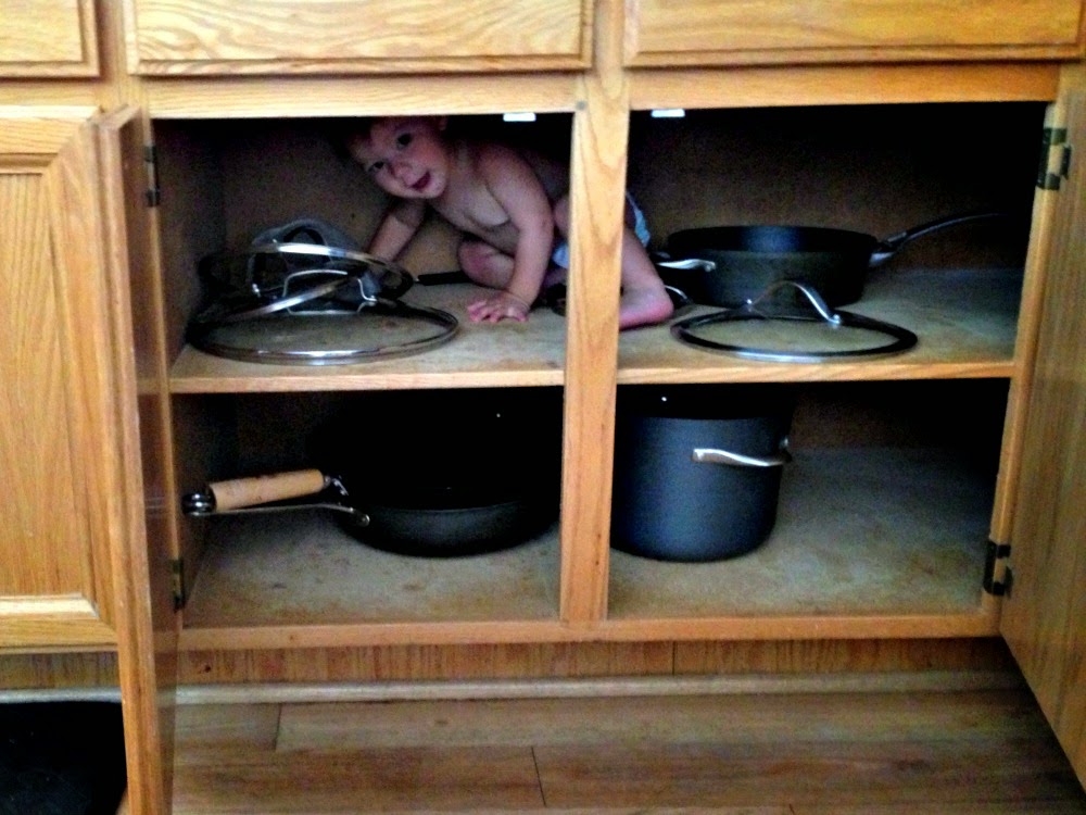 • This was before we put child locks on the cabinets. I was sitting in the living room and I heard him making noise. I look over and see him trying to get in the cabinet. So I went to get my camera and stood back to watch what he would do. He is a very determined little boy and doesn't stop until he gets what he wants, that is for sure!