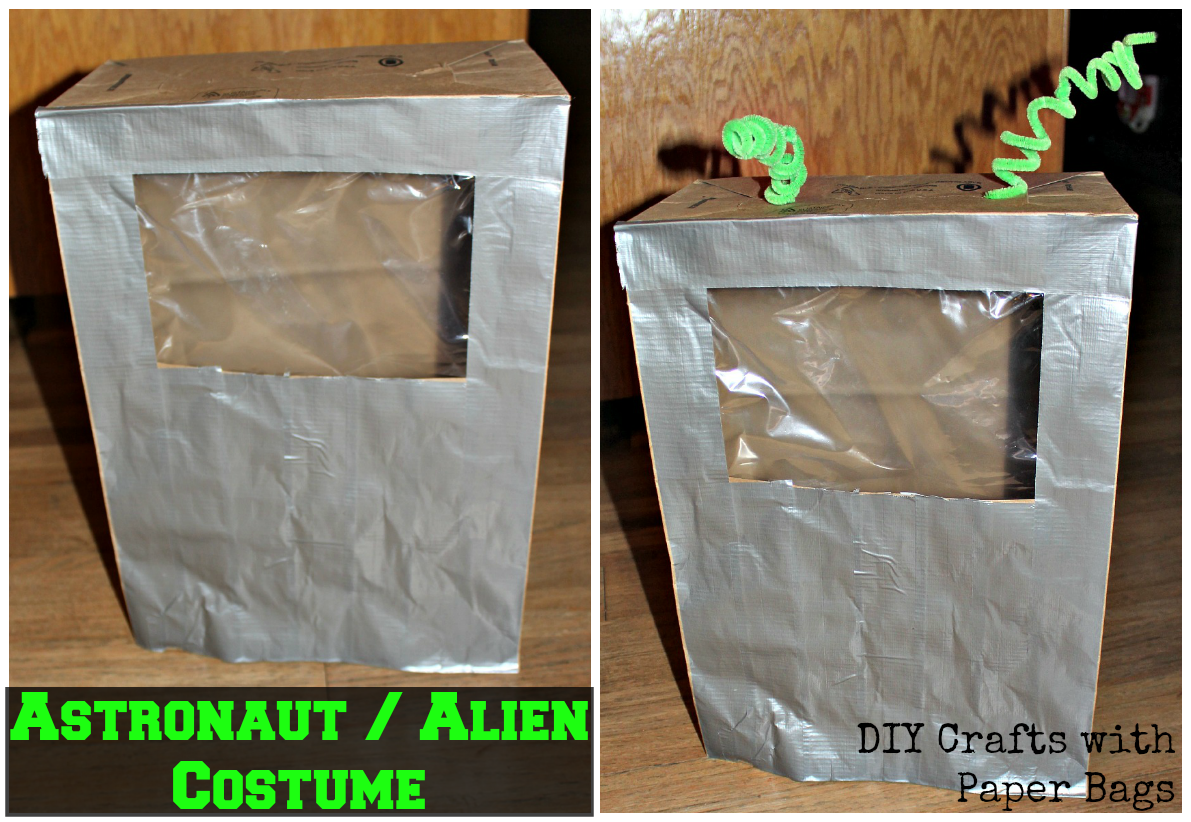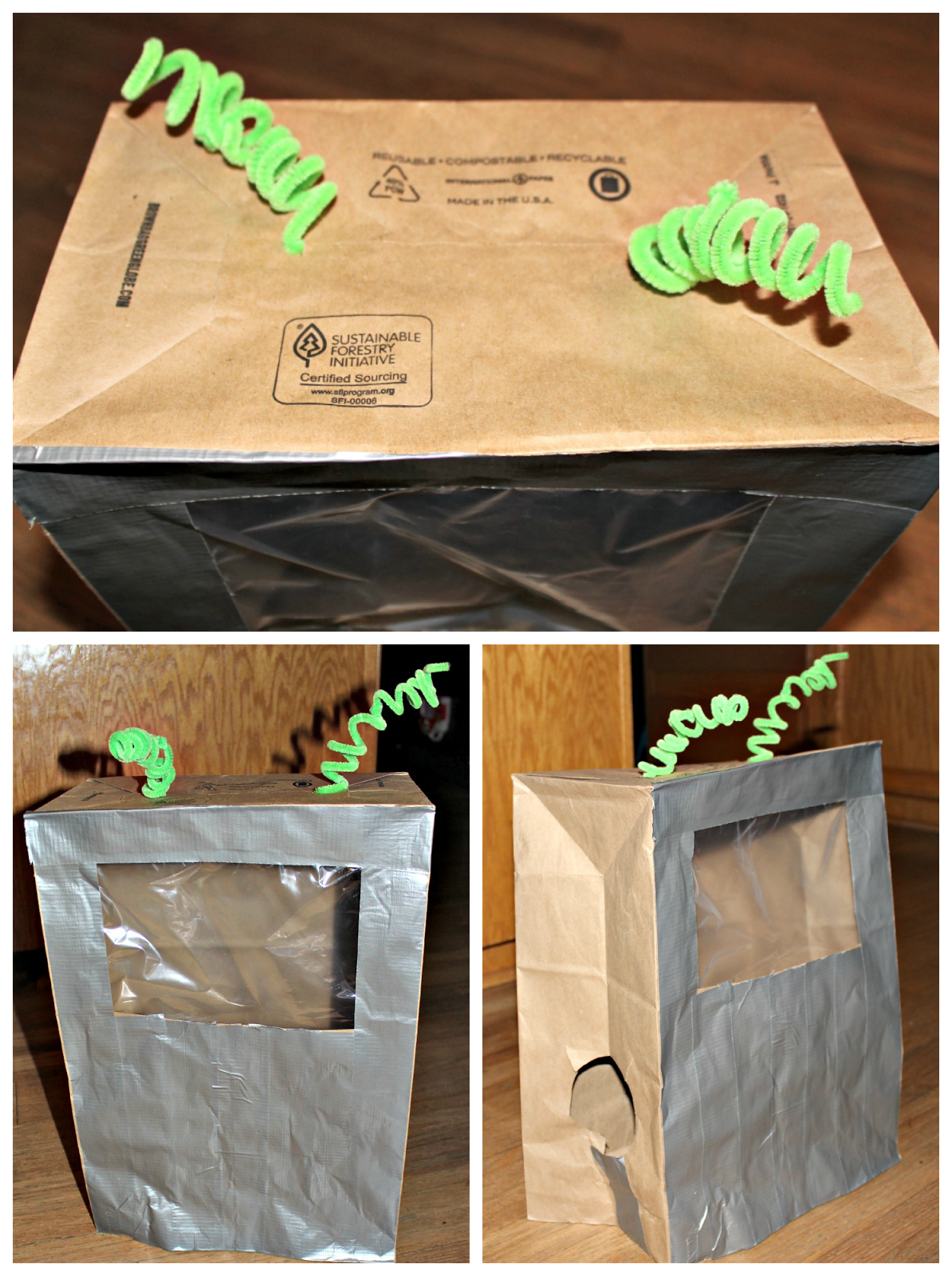 4. If you want to turn your astronaut into an alien just add two pipe cleaners to the top of the bag. I picked green ones to fit the alien theme, twirled them around my finger, and poked them through the top of the bag.