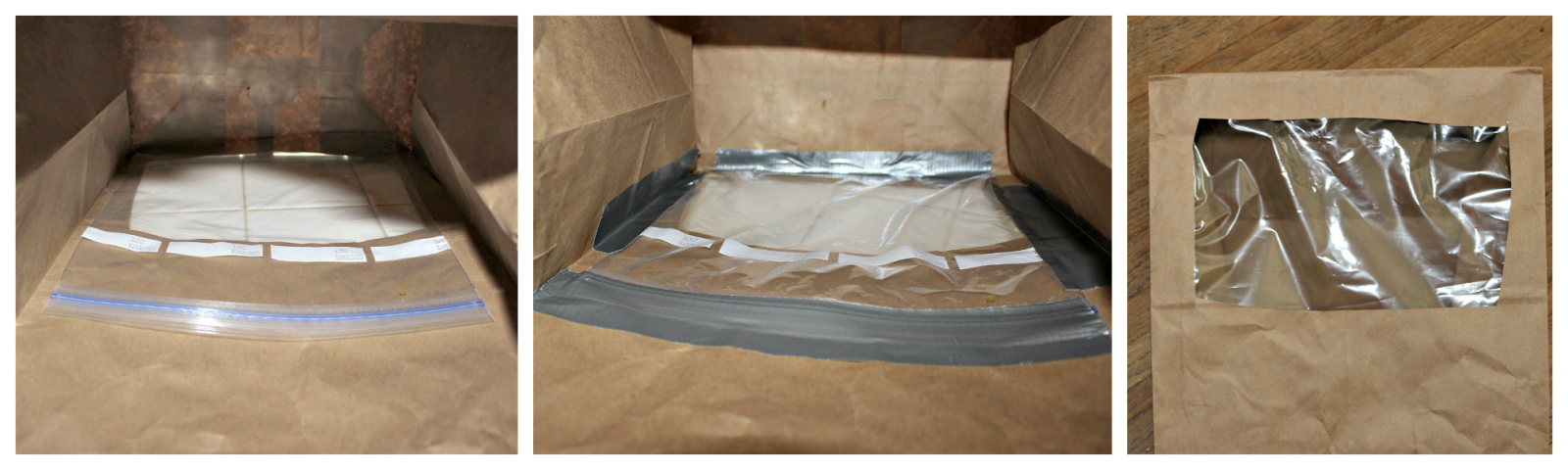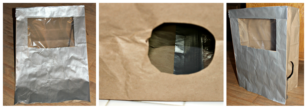 2. Place the zip-lock gallon freezer bag inside of the paper bag directly over the hole you just cut. Tape all four sides of the plastic bag down to the paper bag with duck tape.