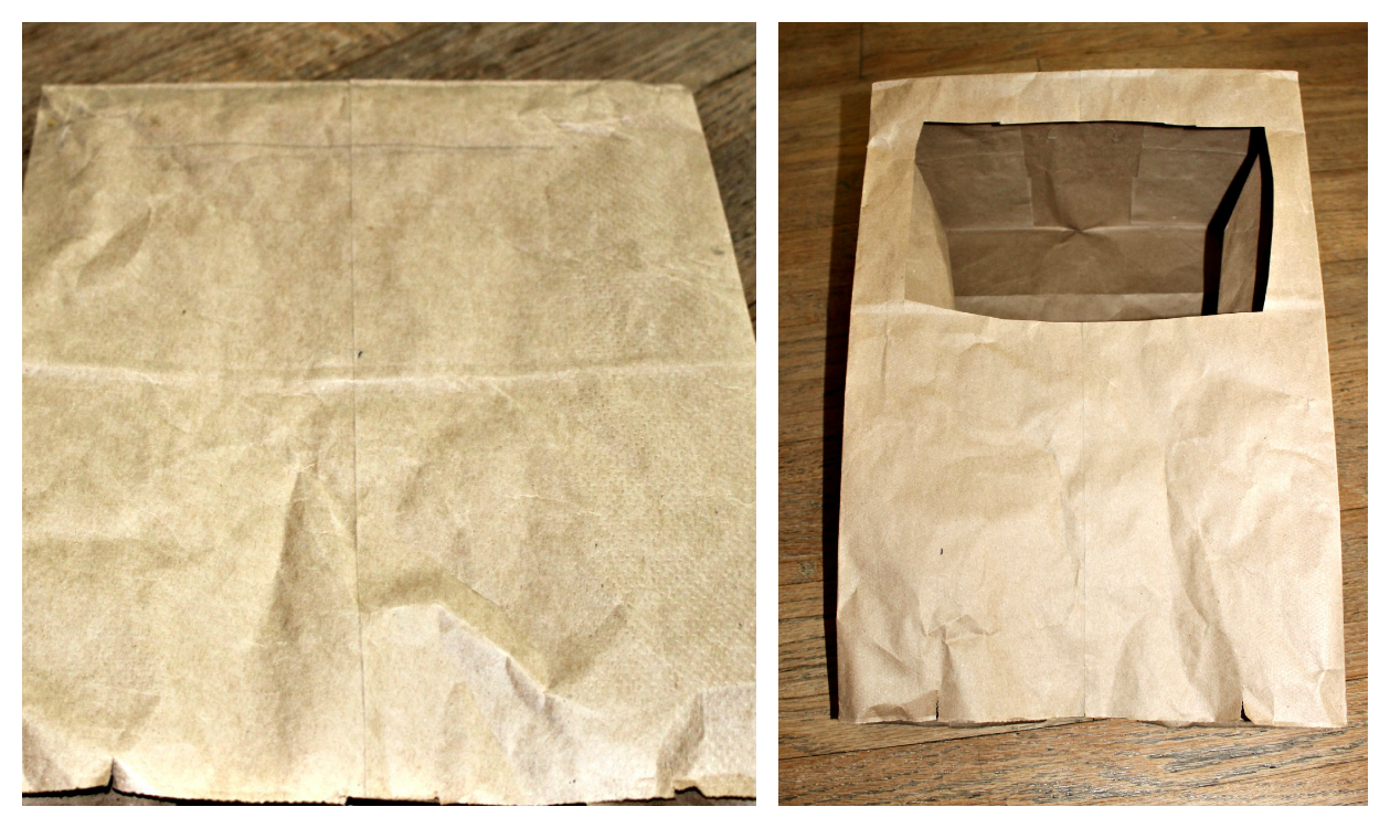 1. Start by measuring and marking with a pencil where the hole for the face should be. I put the bag next to the son and roughly estimated (while chasing him around the kitchen) the dimensions of the face cut-out. If your kid (like mine) does not want to cooperate, just make it start about an inch in from the top and sides and then as long as their face is. I think the picture below is a good estimation reference.