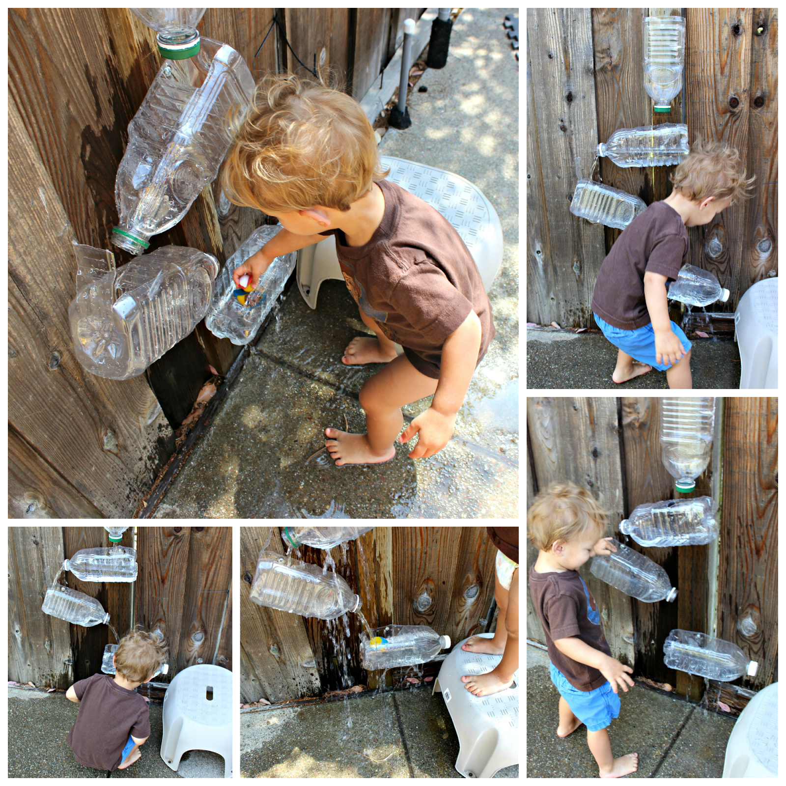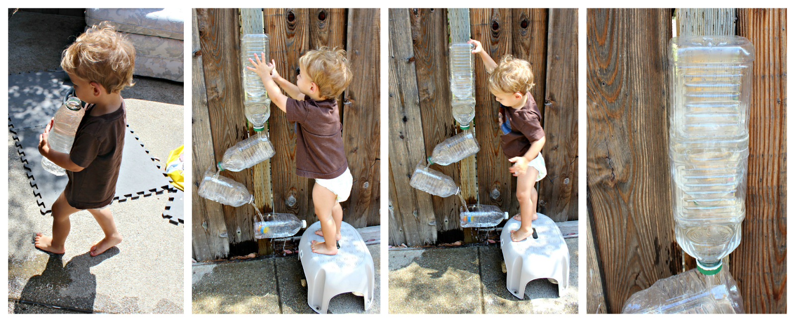 Last week in this series I introduced you all to glow-in-the-dark bowling. Now that would have worked great for this week as well. However, I already had my mind completely set on an idea when I saw plastic bottles on the items list for this series. I knew immediately what I was going to do with them and I was super excited. I have been looking forward to trying this project out ever since I pinned this image months back onto my DIY Myles board. To be honest, I probably never would have gotten around to doing it if it weren't for this series. So I am loving trying all these project and ideas out with Myles. Unlike last week, so far Myles is loving his plastic bottle waterfall. I'm guessing because it involves water and getting messy. Also he is really intrigued by how the whole thing works; he has been moving the bottles around and sticking his hands in them trying to figure it all out! This has already given us lots of fun playtime in the summer heat!