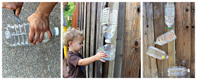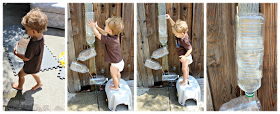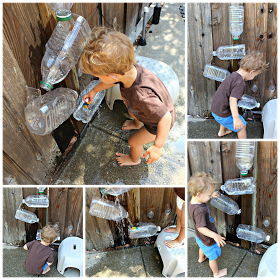 Last week in this series I introduced you all to glow-in-the-dark bowling. Now that would have worked great for this week as well. However, I already had my mind completely set on an idea when I saw plastic bottles on the items list for this series. I knew immediately what I was going to do with them and I was super excited. I have been looking forward to trying this project out ever since I pinned this image months back onto my DIY Myles board. To be honest, I probably never would have gotten around to doing it if it weren't for this series. So I am loving trying all these project and ideas out with Myles. Unlike last week, so far Myles is loving his plastic bottle waterfall. I'm guessing because it involves water and getting messy. Also he is really intrigued by how the whole thing works; he has been moving the bottles around and sticking his hands in them trying to figure it all out! This has already given us lots of fun playtime in the summer heat!