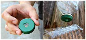 *Tip: we noticed that after we put the whole thing together the water from the top bottle was mostly just splattering out all over. So Mark thought of the idea to put the cap back on the bottle and cut a small hole into the middle. He is so smart because it worked perfectly!*