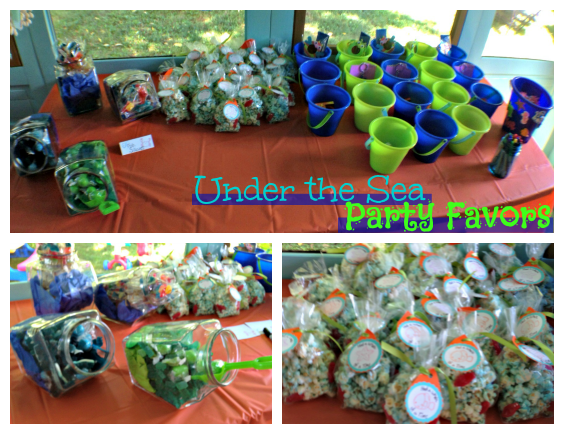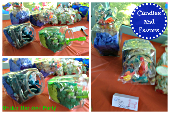On the far left is different kinds of blue and green candies in the glass jars. The kids were able to pick these out as a prize for one of the games. Next to that are two jars for the gummy skewers. I gave one to each kid in their buckets before they left. In the middle is the fish tank popcorn. These were a thank you/favor for each family to take home as they left. Most were ate during the party as a dessert though, which turned out just fine. And on the right are the sand buckets that each kid got to decorate and take home with all of their goodies inside.