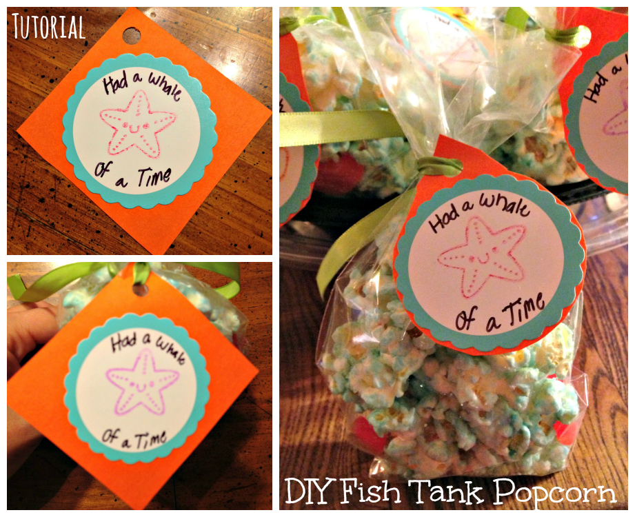 I made these tags a couple nights before so they would be ready to be put together once the bags were filled. I bought a pack of circle stickers at Party City in the dessert making aisle. I placed them onto a piece of orange paper (that I had already cut down to size). Then I stamped them with a starfish and wrote "Had a Whale of a Time" on them. I punched a whole in the top, tied them up with some green ribbon, and cut off the extra orange paper.