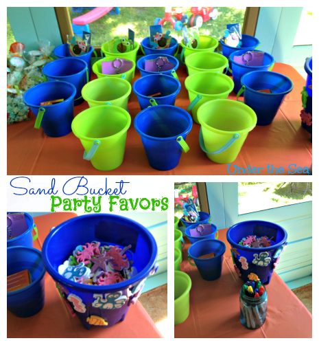 Here is a close up of the buckets we used for the party favors. Each bucket had a 'bigger' favor inside and every child got to pick out which one they wanted and decorate their bucket. We set out a jar of sharpies and a bucket full of marine animal foam stickers that my mom found at Michael's. I just made sure they wrote their names on their bucket and then let them decorate them however they wanted!PARTY FOOD