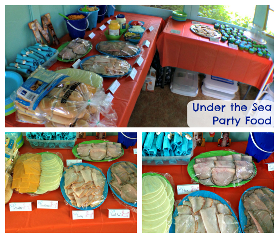For the main meal we had submarine sandwiches. I got two cheeses, three meats, and toppings for everyone to make their own sub sandwiches. We also had "Conch Shells and Cheese" for a side that my mother made. I didn't get a picture nor do I remember the recipe, but it was the talk of the party! You can also see the cupcakes on the back table that my aunt made. I showed her these fish cupcakes for the inspiration.