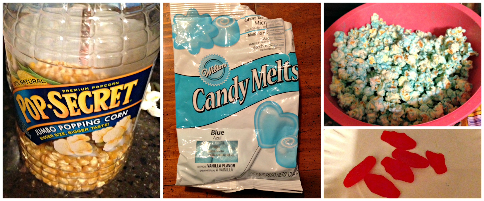 My cousin made the popcorn portion of this favor. I had never used the chocolate candy melts before and this tutorial wasn't very thorough, so I wasn't really sure what we were getting into. We pretty much just winged it and somehow it turned out amazing... not that you can really go wrong with any sort of combination of chocolate and popcorn! She made these in several small batches to make sure they would turn out okay. First she popped the popcorn using my mother's popcorn machine (microwave should work just fine though). Next, she took a handful of the blue candy melts and heated them up with the microwave. Then she poured the melted chocolate into the popcorn bowl and mixed it up with her hands. Once the popcorn and chocolate have cooled, place into plastic bags and add Swedish Fish. *We learned that it is very important to let the popcorn cool first because otherwise the chocolate is not hardened onto the popcorn and it will smear all over the plastic bag.*