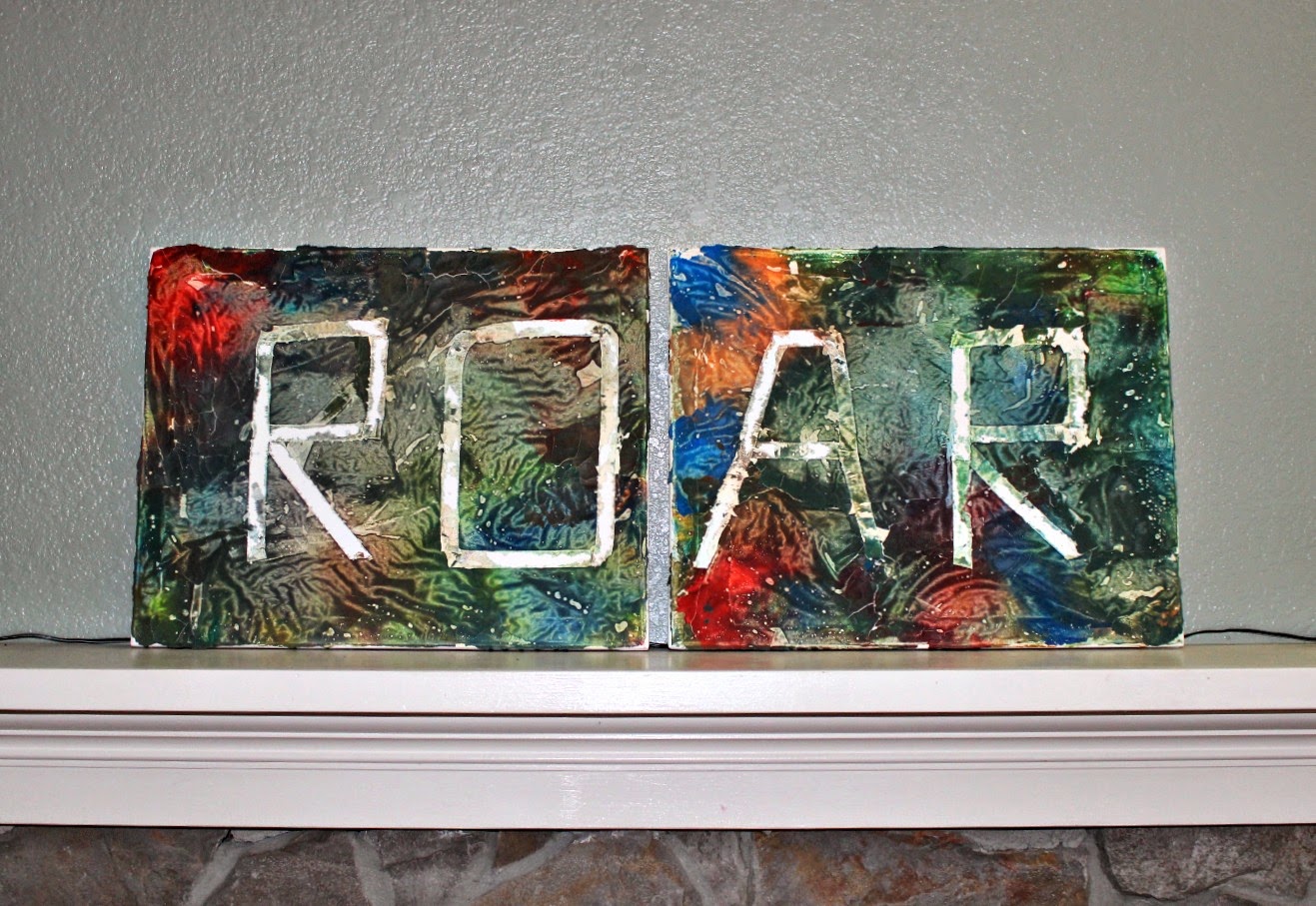 This item was a little hard to get creative with. I thought about putting together some noise makers perfect for the 4th of July using paper towel/toilet paper rolls and wax paper, but the post would be late by 3 days. I still think it would be fun for New Years or birthday parties though. Other than that, I could only think of the typical crayon melting with wax paper crafts. Although the shapes and ideas for that are endless, I was really hoping to think of something different. Unfortunately, the big idea never came to me, so I did the melted crayons, but with slight variation. We are in the process of moving this weekend, so I found this to be the perfect time to change Myles' still nursery into his big boy room. I decided on a dinosaur theme and am pretty excited to start decorating it. I figured I would do double duty and use this week's project to make the first piece of art for Myles' new room. So here is: