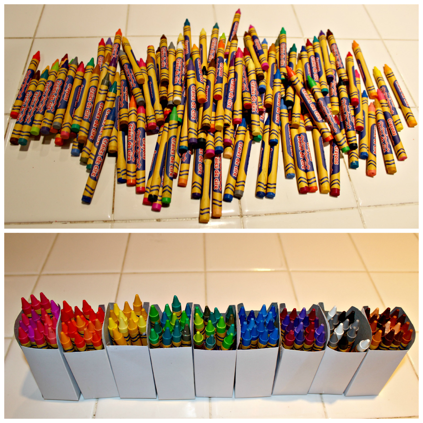 1. Start by sorting your crayons. You will want certain colors in certain areas on the canvas(es), so the crayons need to be sorted before you shred them. I used three 48 count boxes from the Dollar Tree.