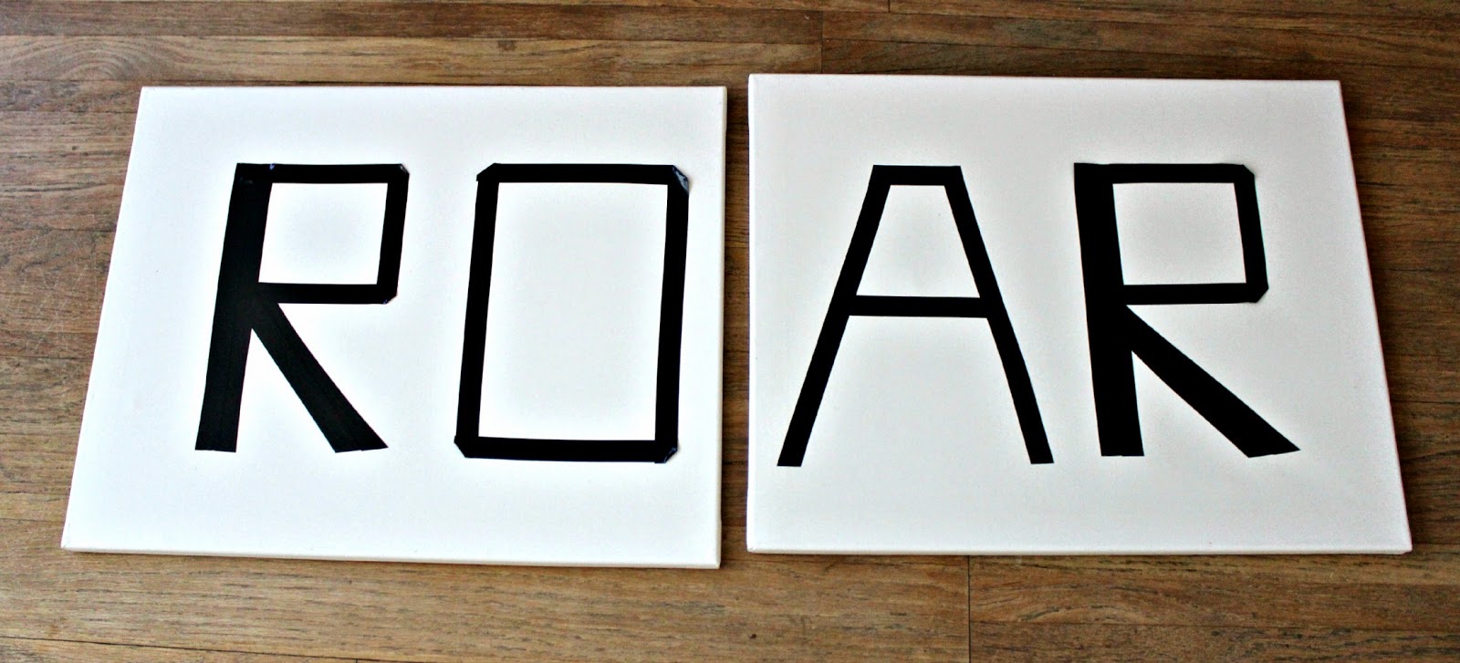 4. Next, get your canvas(es). Use the tape to mark out the word(s) or pattern you want to have left white on the canvas. I stuck with the dinosaur theme and spelled out 'ROAR'.