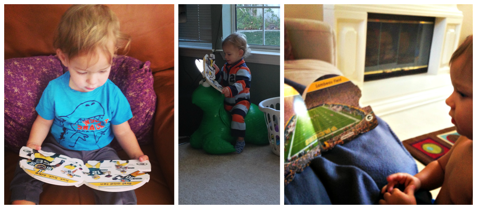 6. Green Bay Packers 101 (My First Team-Board-Book): This book was a Christmas present from my aunt, uncle, and cousin. Half of my family cheer for the Bears and the other half the Packers. My father has been a die-hard Packers fan since before I was born so I am raising Myles that way. Anytime he sees his Packer gear, he always says "PaPa" and whenever I ask him what shirt he wants to wear, he points to his Packers jersey and says "PaPa". He got this book for his 1st Christmas when he was only 4 months, so we kept it up until he started being interested in books. As soon as I brought it out, it became an instant hit with Myles. It was his go-to book for a long time. At some point every day, he would pick it up and read it: