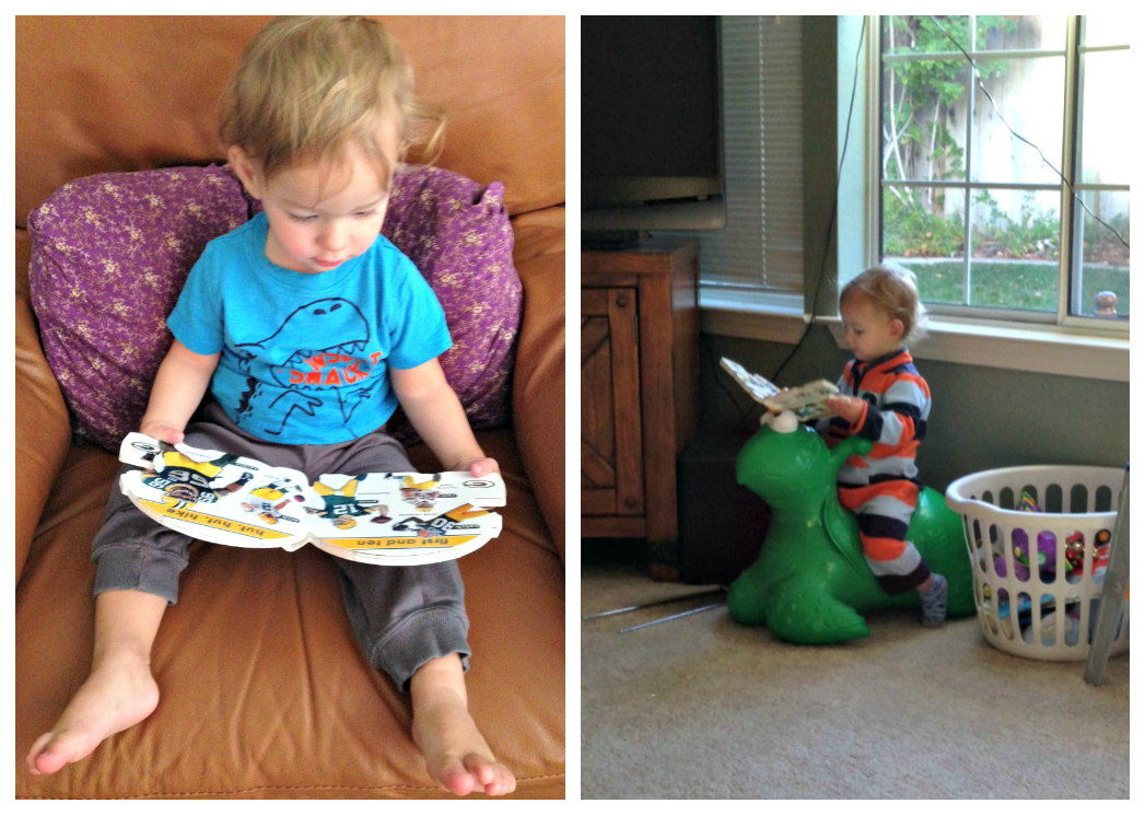 - Loving his books: his favorites this month were his Barney Farm songs book, Panda in the Park, My First Packer book, and his family photo book.