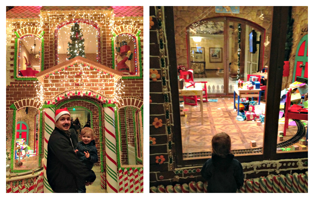This was the ginger bread house at the Fairmont Hotel. It was two-stories and made out of graham crackers with candy cane and frosting decor! Myles was most fascinated by the train inside!