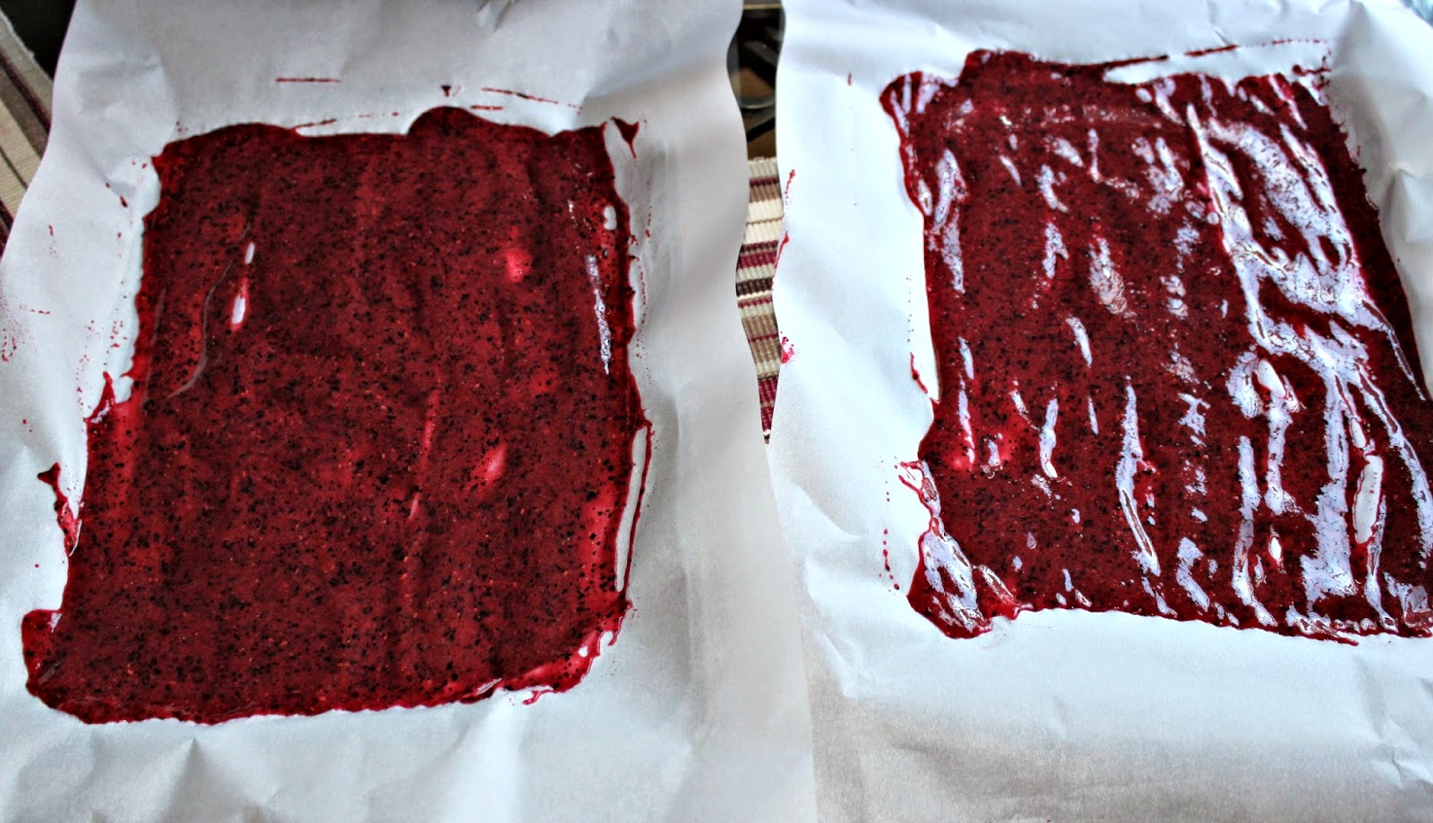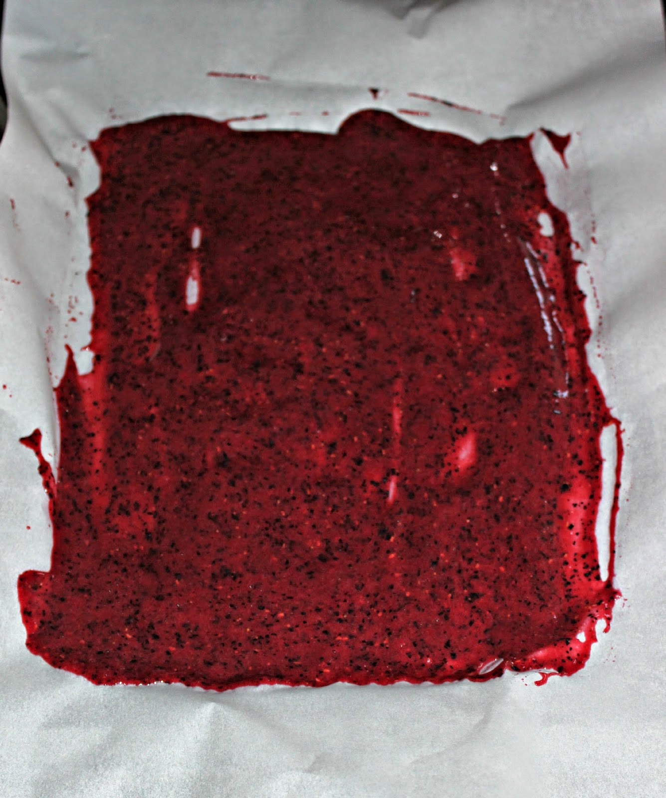 5. Pour the fruit mixture onto the parchment paper lined pans. Spread out with a spatula to make as even as possible.