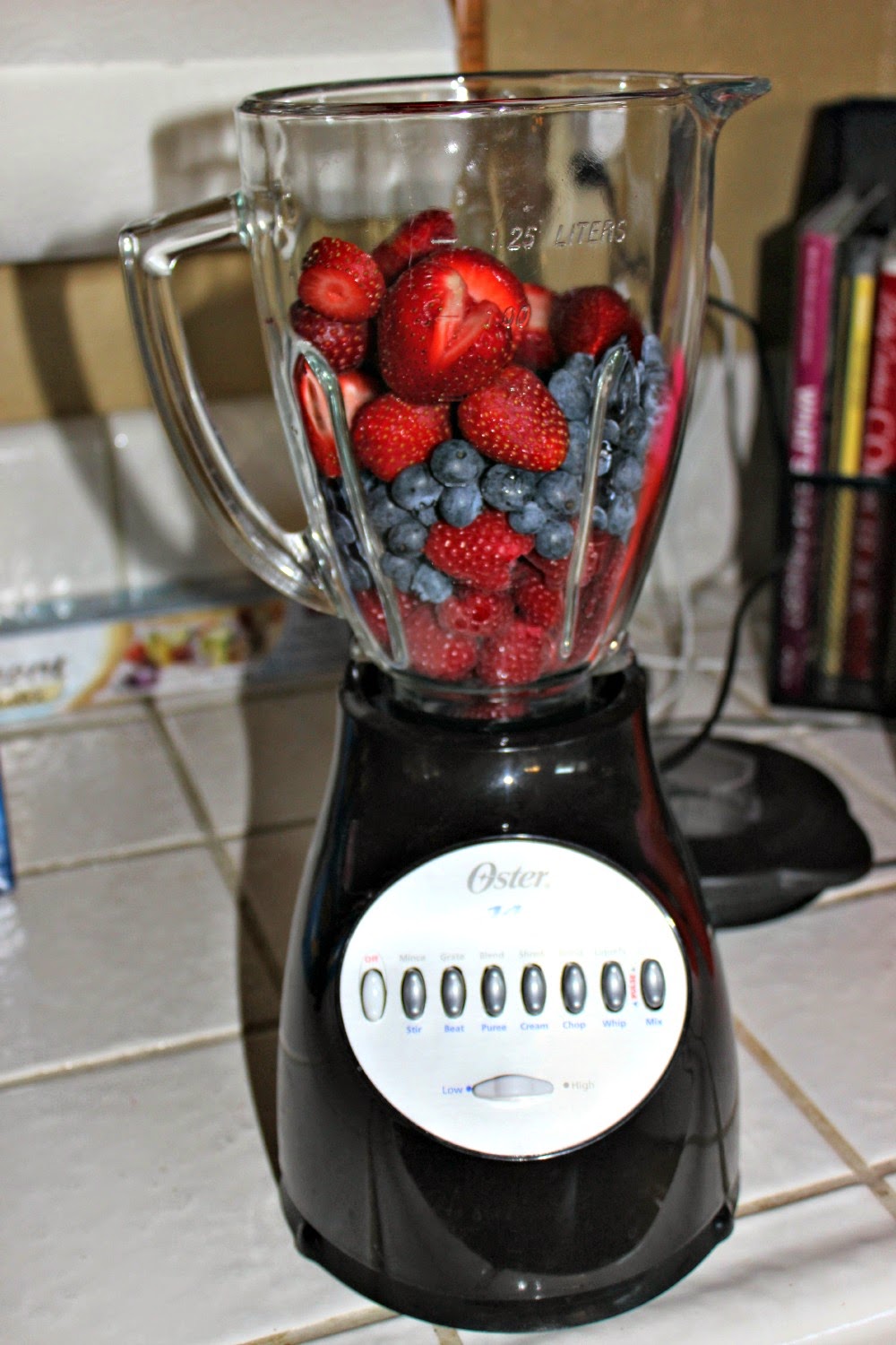 2. Prepare your fruit (rinse, de-stem, etc.) Measure out 3 cups and pour into blender. I chose to use raspberries, strawberries, and blueberries. The raspberries made it very tart, so be wary of that when choosing your fruit.