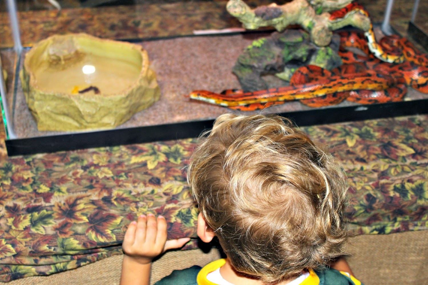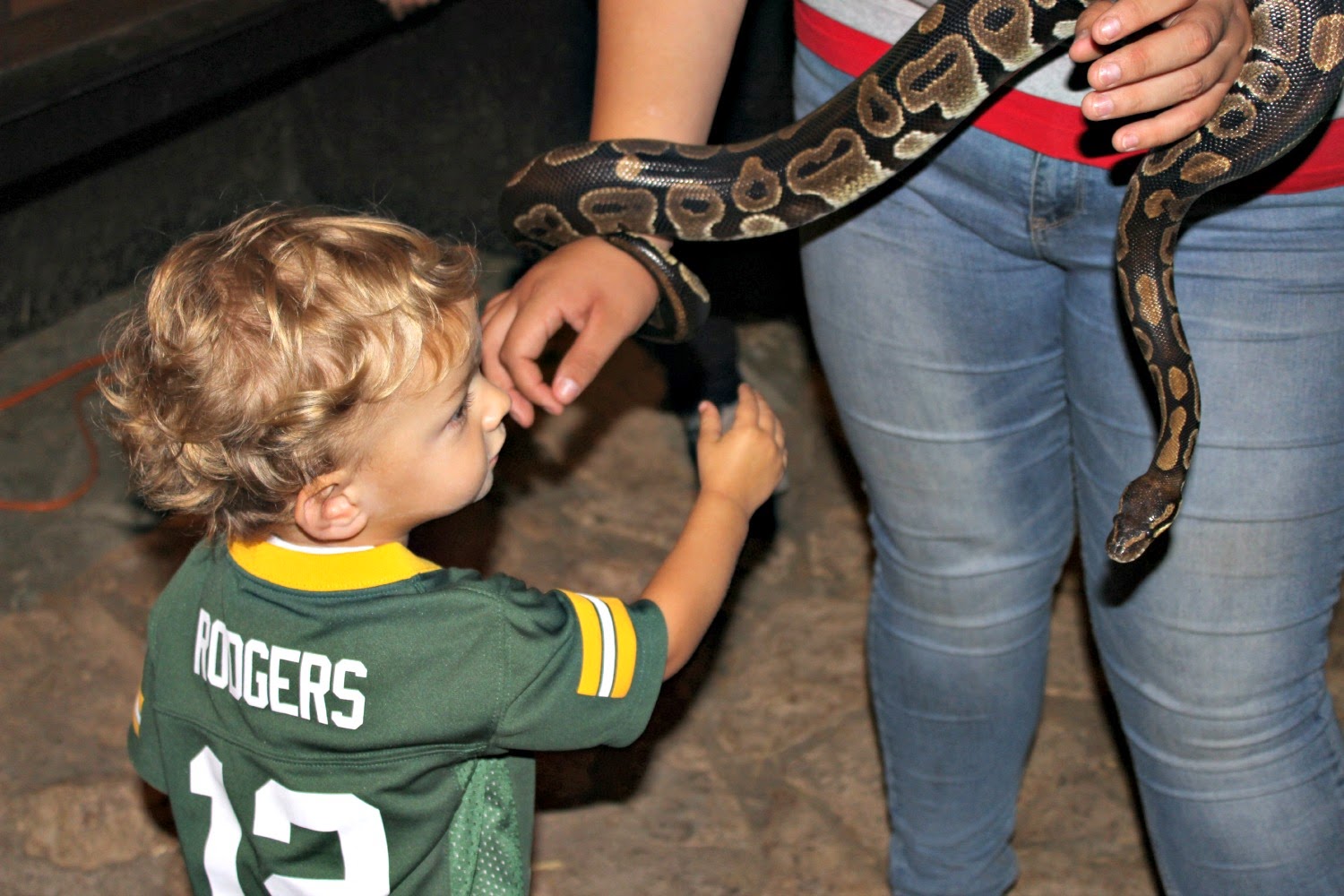 Myles touched this snake a couple of times. At first he touched the tail and I missed the picture so I asked him to touch it again. Then he reached for its head (this picture was taken right between him touching the tail and then going for the head), the lady jerked back, and Myles got a little freaked out. I guess she wasn't expected that as most people know not to go for the head, but Myles really had no idea and was scared by her reaction. After that he was done with the snakes.