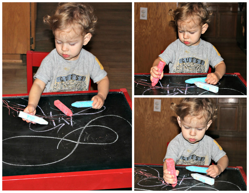 • I finally bought some chalk for Myles' Ikea table and I let him play around with drawing. This was the first time I saw him really try to make a 'drawing/picture'. It was just lines and such, but I could tell he was really thinking and trying to make something.