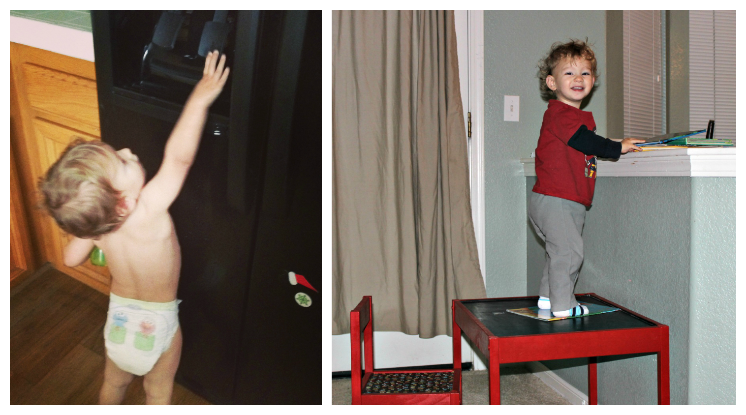 •  Trouble: I learned that having a 'lock' button on the fridge water/ice dispenser is very useful! He could finally reach it and would make a mess with the water everywhere. Also still loving to climb anything and everything... and he was very proud accomplishments!