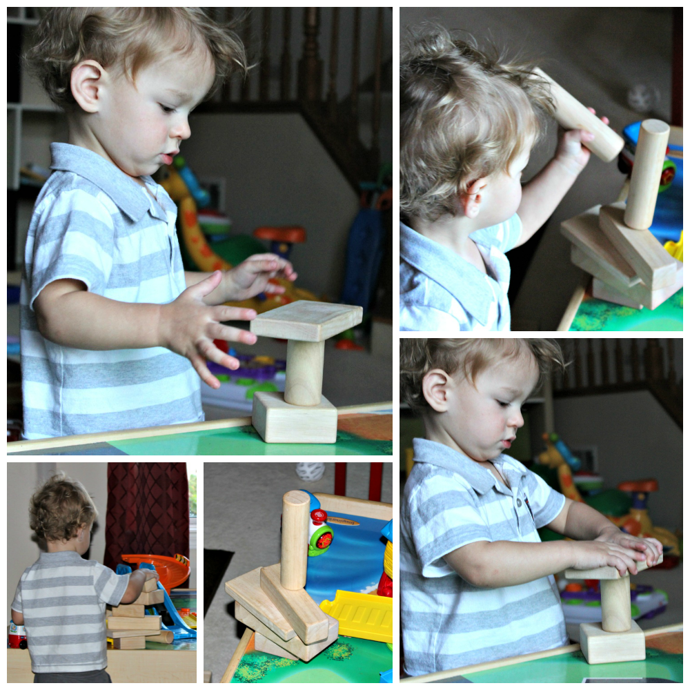 • This one was a big one for me: out of no where one day he started stacking his blocks! We were sitting in his playroom and he just walked over to his table and starting playing with his block all on his own. I had never seen him do this before so I was shocked. I ran and grabbed my camera to document this awesome first!