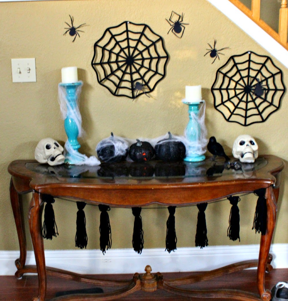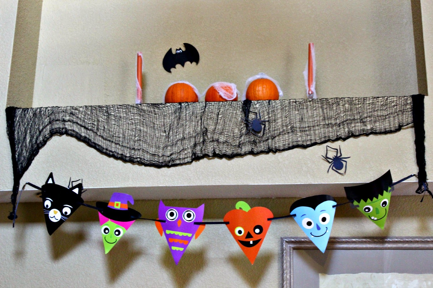 We have this area on the wall when you first walk in that is like a little ledge that comes down from the vaulted ceilings. I haven't done anything with it yet, so I thought why not put some Halloween decor up there. Myles LOVED it and talked about all the decorations all day long, so it was a success in my book.