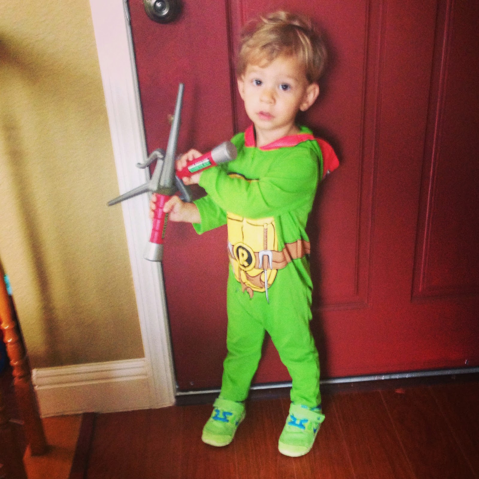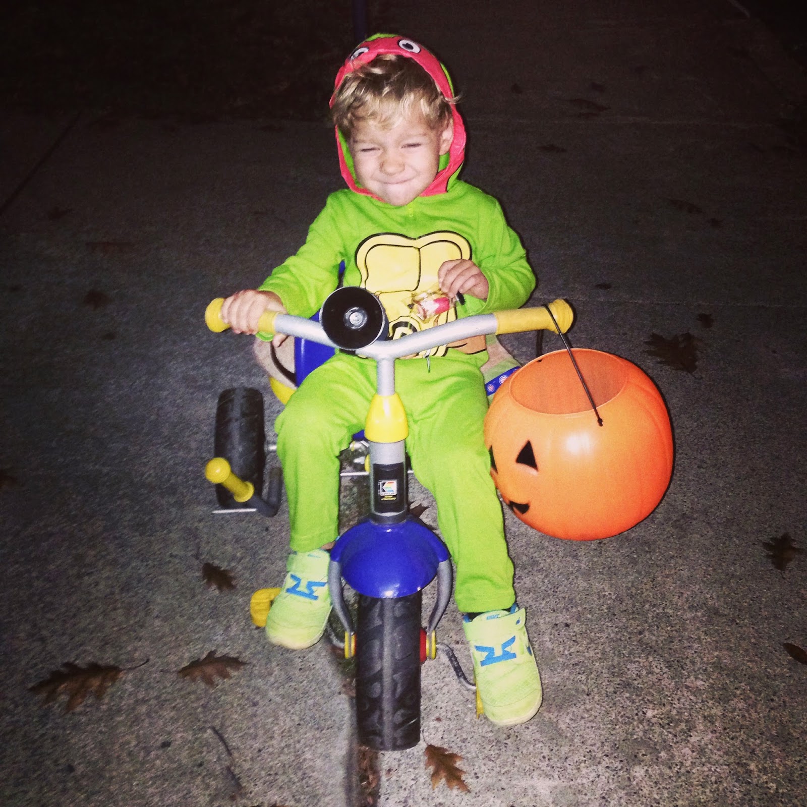 Last year Halloween night was pretty awesome, so I wasn't sure if this year would compare... especially since Myles decided he no longer wanted to wear the Spider-man costume that he picked out! He had been telling me he wanted to be Spider-man for weeks so that's what I bought. He wore it around the house a couple times, and then as actual Halloween got closer and closer he wanted nothing to do with it... like meltdown city style. So I returned it and started brainstorming a plan b. I could only gather that what he didn't like about the costume was the puffy muscle part and I already knew that he wouldn't go for anything on his face. I went to Target to see if I could find something that was like pajamas, but could still be seen as a costume... no such luck. Then I went to the Spirit store and found a Ninja Turtle onesie that was just like normal clothes. Myles picked out the Raphael one and I was very hopeful this one would work out! It took a little coaxing and explaining but we had success!
