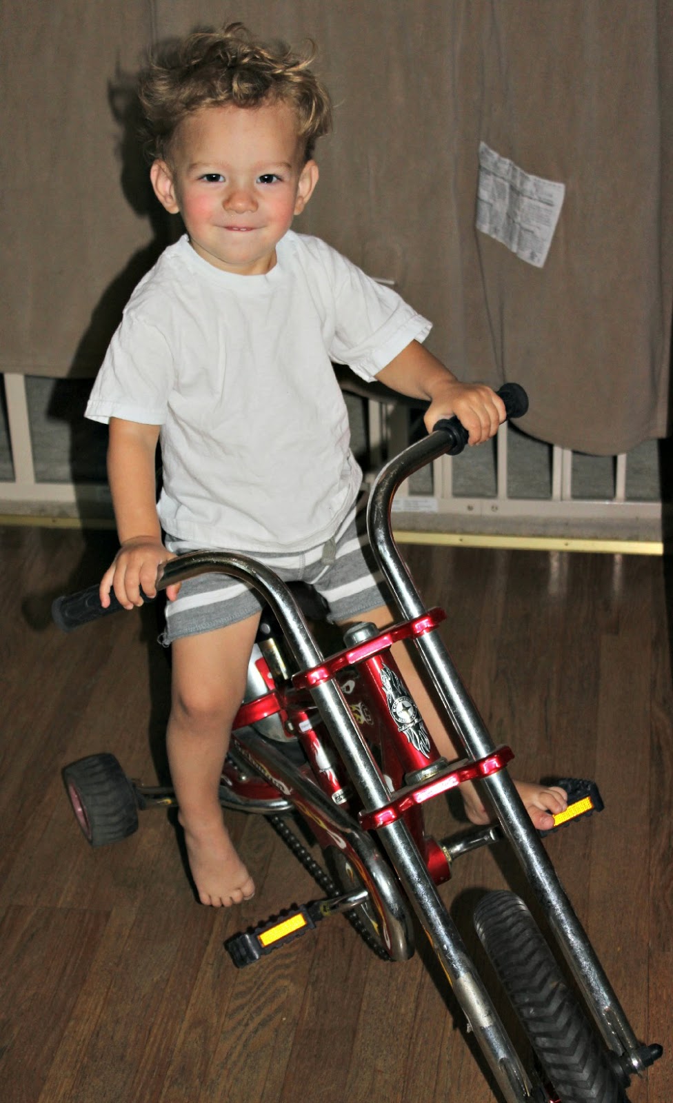 - We were given our first real bike from some friends. Although he is still a ways out from riding it, he loves to sit on it and be pushed around. He can almost touch the peddles now, but is still not into learning to ride. We are steady working on that one.