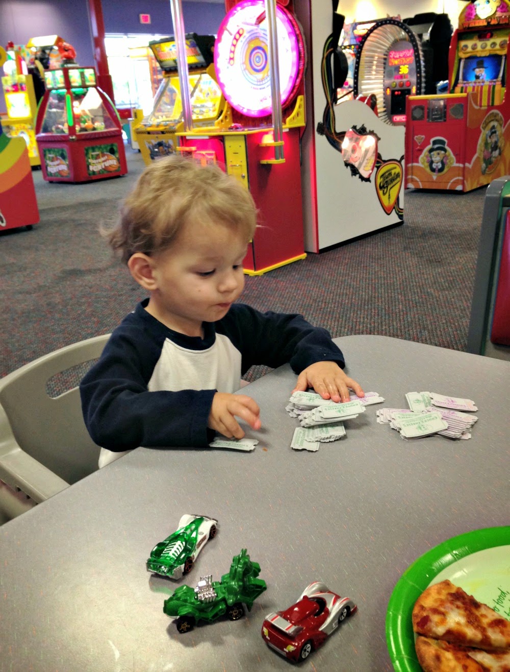 Progressively eating more and more with each passing month. He has never been a big eater; never ate baby food, and took a long time to start eating a significant amount of anything. He had been eating a decent lunch for a couple of months now, so I was happy with that and just waiting for him to do the same for breakfast and dinner. This day we played and ate lunch at Chuck E Cheese and I just had to take a video to document how much he ate of his pizza. I would say that this was the most he ever ate in one sitting: