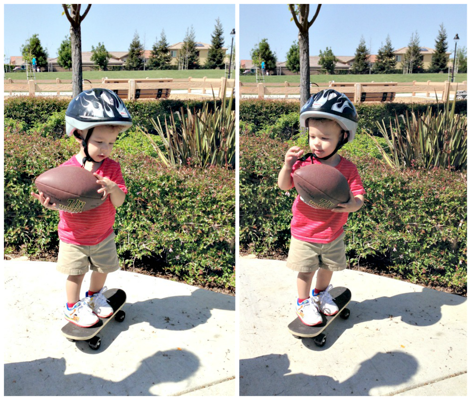 - My dad bought him his first skateboard last month when he was visiting. This thing is very slow, so it is perfect for his age. He couldn't ride by himself of course, but he loved to be pushed on it. I am hoping he wants to learn to ride it as he grows because I think it is really good for coordination.