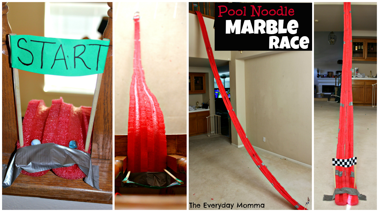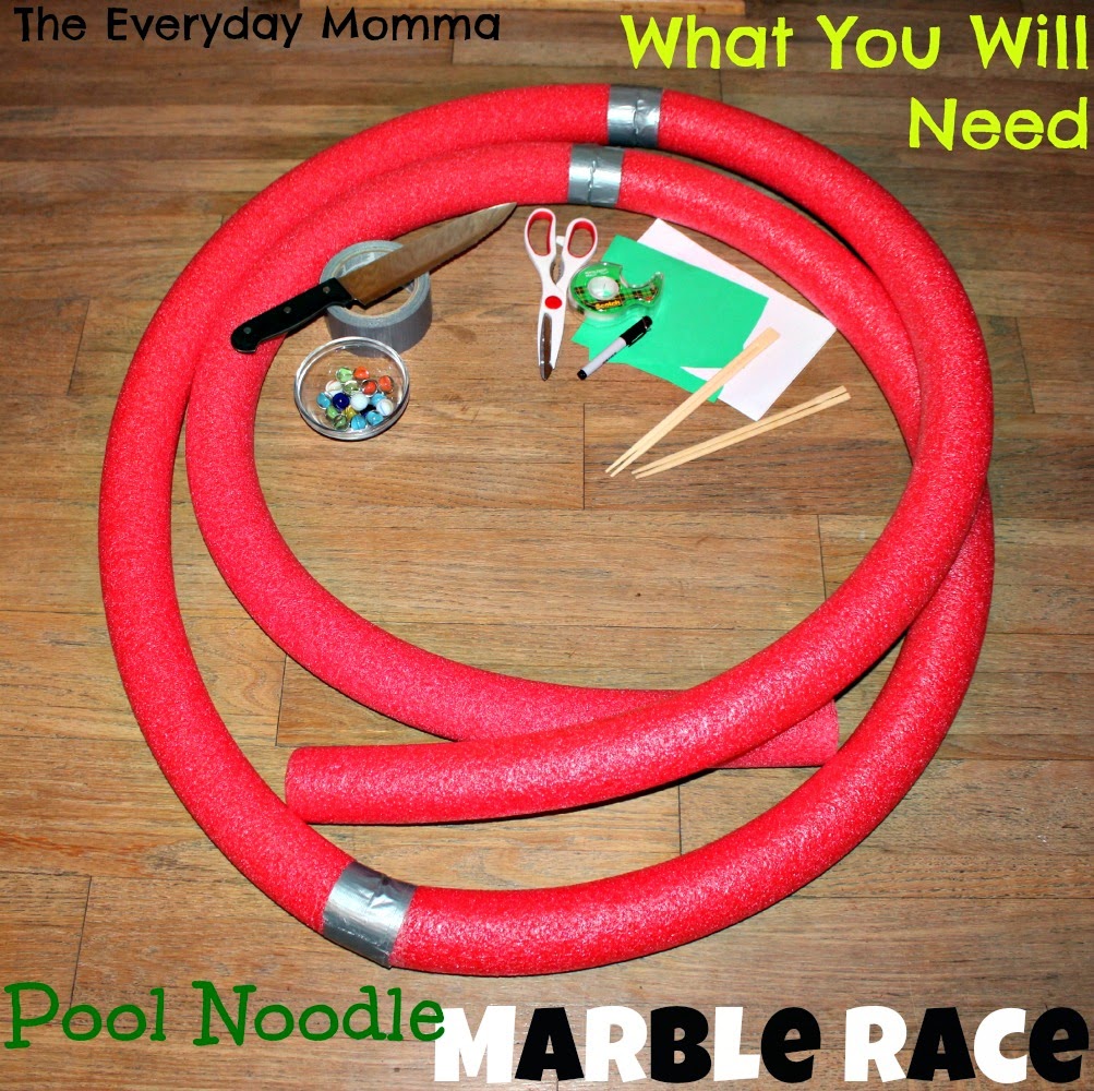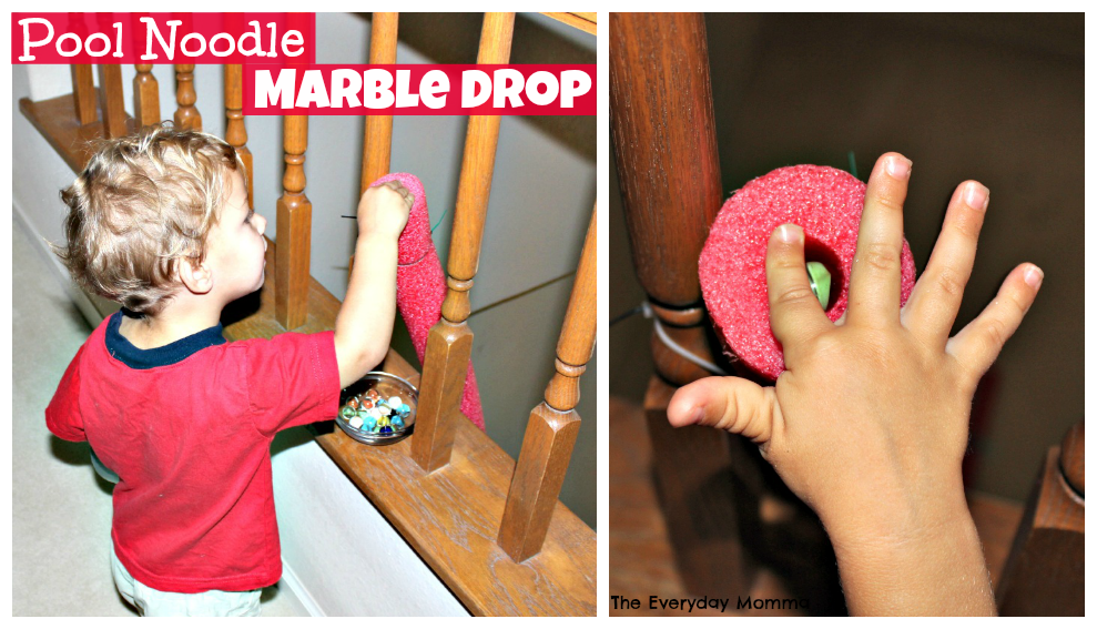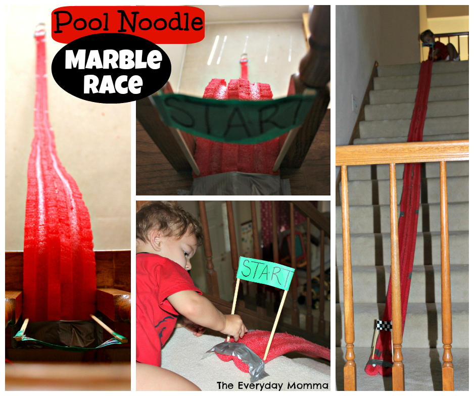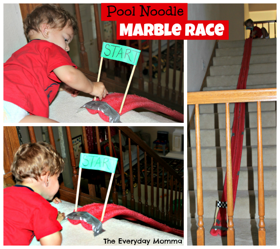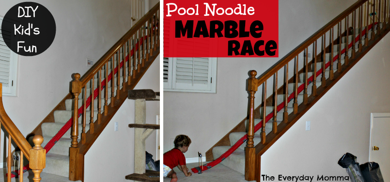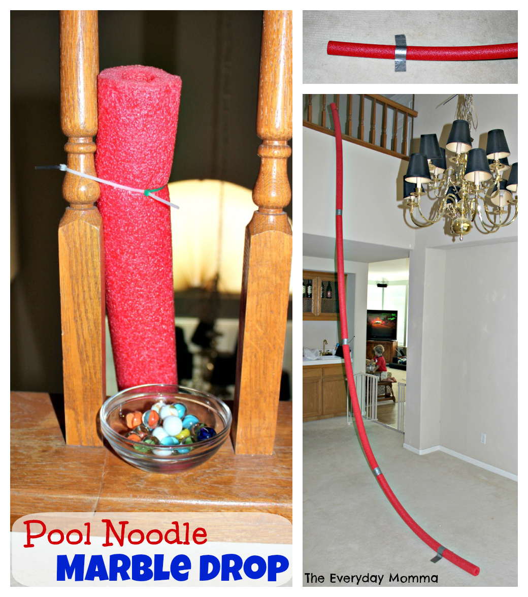 I had an idea for pool noodles circling its way around my brain since the beginning of this series. My inspiration came from the second story walk way we have overlooking the entry way and dinning room in our house. I thought how fun would it be to drop marbles down the noodles from the top of the walk way to the floors down below. That was the beginning of my idea and then I saw the pool noodle marble race on Pinterest, so I thought we would try that out after the marble drop.
