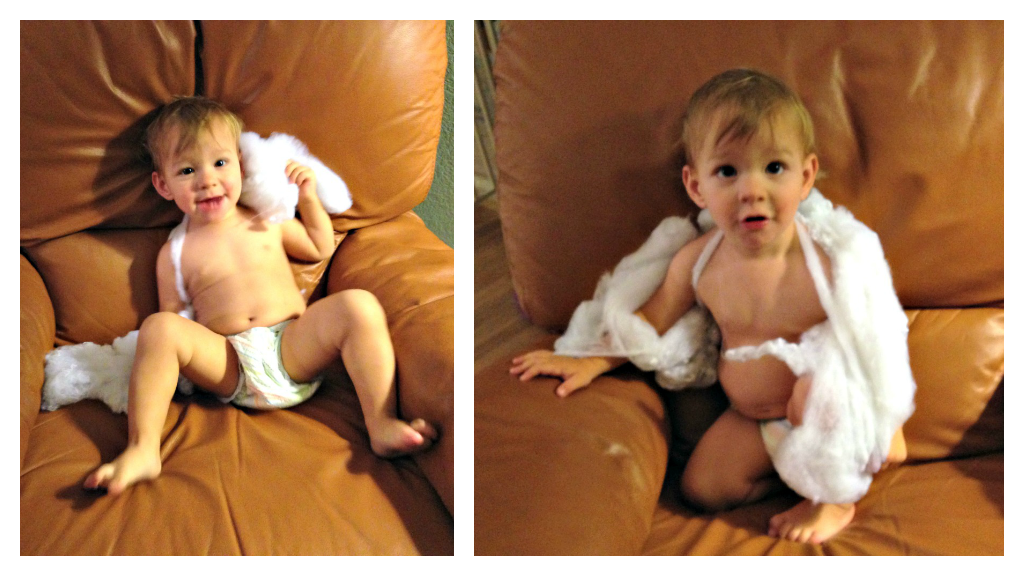 Before I got to making the marble race, I made a marble drop for Myles to try out. We have high ceilings, so I was able to hang the noodles from the second story walk way and let them drop to the first. I attached them to the top banisters with zip ties. I dropped the noodles into our unused dining room and secured them to the ground with a piece of duck tape.