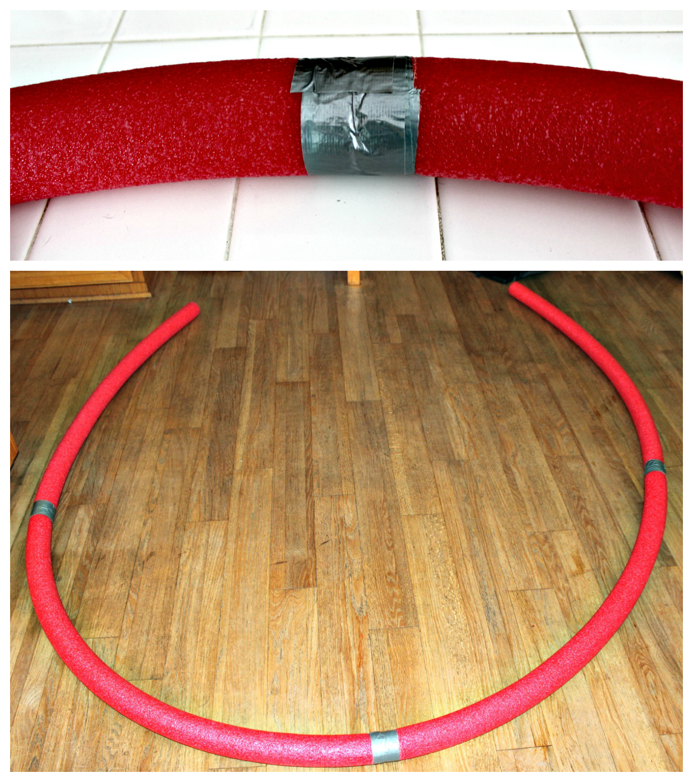 1. Start by taping the pool noodles together with duck tape. I used four noodles, but you may need less based on where you will be setting up the drop/race.