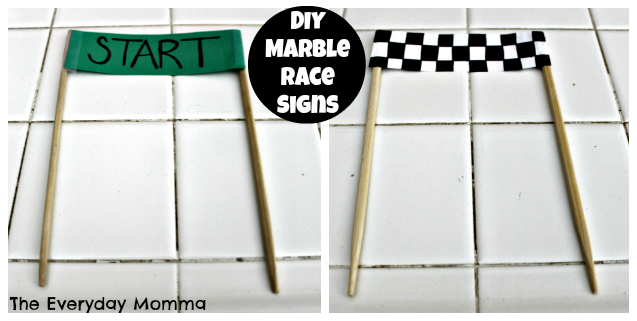 5. Optional: Make the start and finish line banners. I just took some scrap paper I had and made two signs: one green for the start and one checked for the end. I attached them to chop sticks with tape. I've seen toothpicks and skewers used as well.