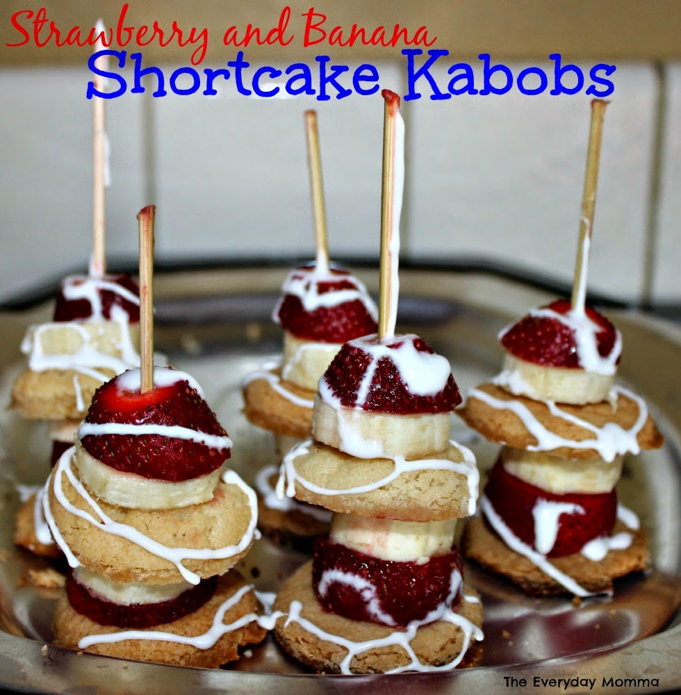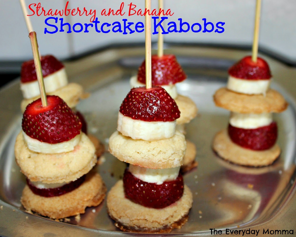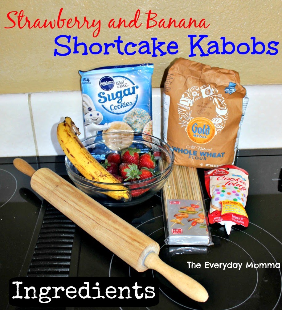 4. Cut wooden skewers in half to make 12 smaller skewers. Assume kabobs by staking cookie, bottom strawberry piece, banana, cookie, banana, and top piece of strawberry.