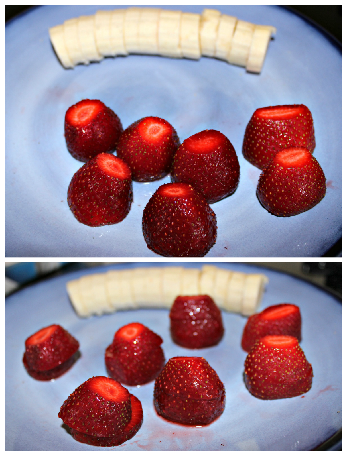 2. While the cookies are baking, cut the strawberries and bananas. Cut bananas into 24 pieces of the same size. For the strawberries, cut the bottom and top off. Then cut each strawberry in half, making 24 pieces. Keep the two pieces from the same strawberry together so that the kabob will stack properly.